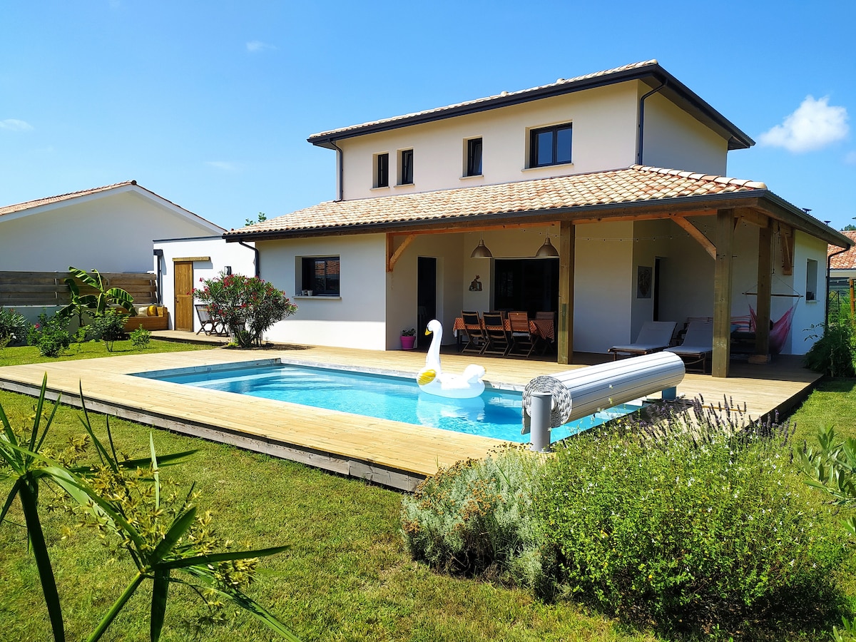 Maison neuve entourée de forêt à côté de la piste cyclable et plages de la côte landaise Elle se compose d’un salon avec cuisine américaine, de 3 chambres dont 1 suite parentale avec sdb et wc , pour finir une autre sdb et wc indépendant . Fibre internet 🛜 Pour l’extérieur une piscine pleins sud de 4 sur 8.5 m chauffée de avril au 11 novembre avec jardin paysager et 110m2 de terrasse en bois . Plage et golf de Moliets et maa à 10mn Vieux boucau 15mn Hossegor 28mn . Biarritz 50mn