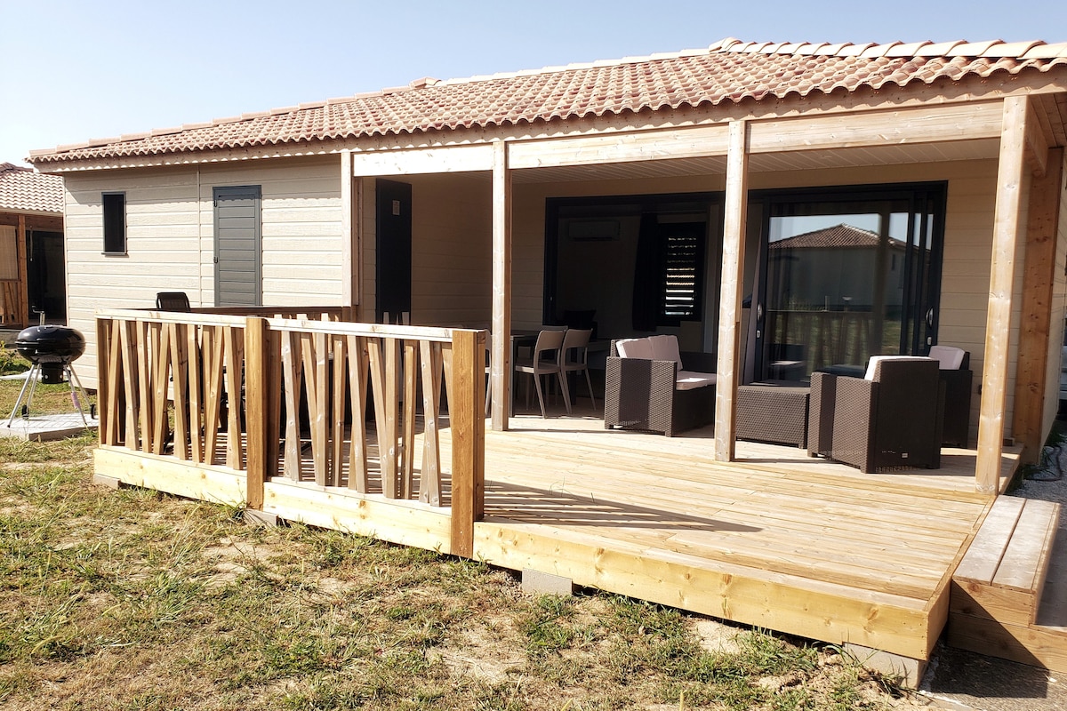 Agréable maison neuve en bois de 60m2 à Saubion, située dans une impasse privée en plein cœur du bourg, à 10 mins des plages de Seignosse, Hossegor, Capbreton. Son environnement est verdoyant et paisible. Elle est propice à la détente et idéale pour les vacances en famille.