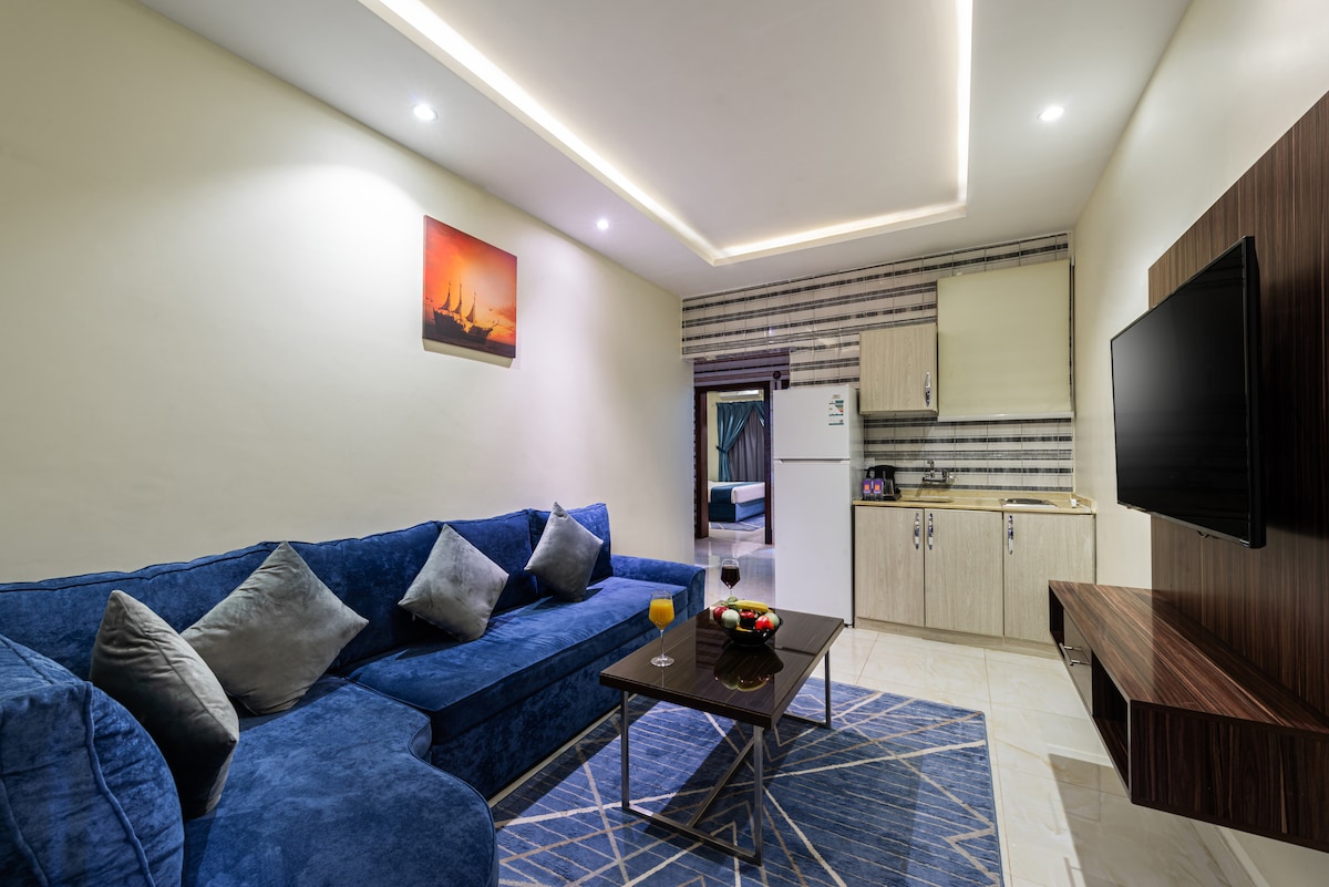This furnished hotel apartment is located in the Al-Areedh neighborhood in Medina, offering a central location with easy access to all essential services. The apartment consists of two bedrooms, a spacious living room, a fully equipped kitchen, and a bathroom. The apartment is very spacious, providing comfort and privacy for guests. Right in front of the apartment is a walking path, perfect for enjoying a stroll, with numerous restaurants, groceries, and cafes nearby.