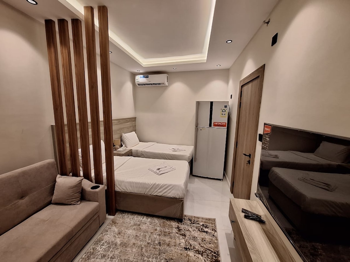 شقة عائلية أنيقة تجمع بين الراحة والعملية، مثالية للإقامة القصيرة أو الطويلة. تضم غرفتين نوم بتصميم عصري؛ الأولى بسرير مزدوج فاخر لشخصين، والثانية بسريرين توأم منفصلين. توفر صالة رحبة للاسترخاء، مطبخ مجهز لإعداد وجباتك المفضلة، ودورة مياة واحدة حديث بعناية ليمنحك الراحة والخصوصية. شقتنا خيارك الأمثل لتجربة إقامة متكاملة تنبض بالترحيب والدفء وكأنك في بيتك الثاني