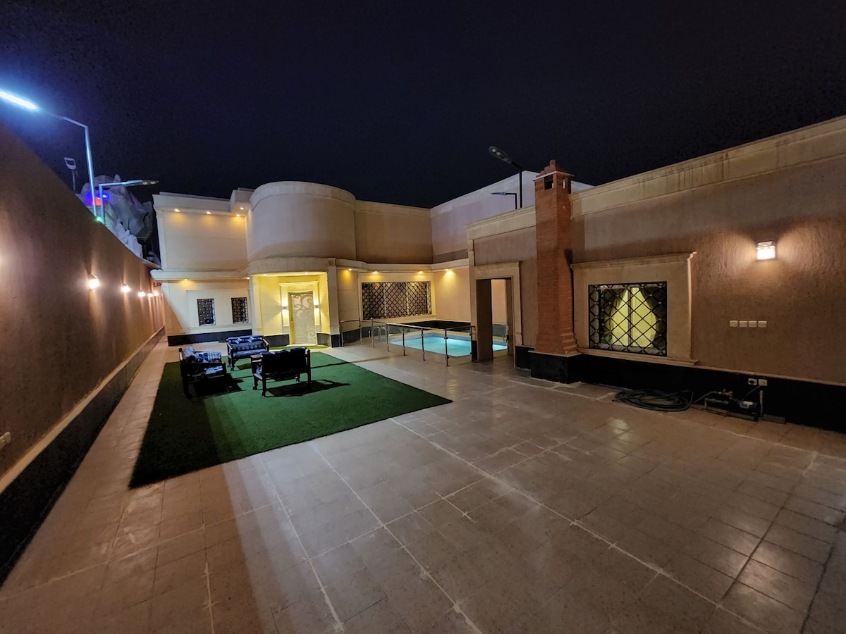 A luxurious guest house for daily rental in Al Malqa district, Riyadh. With an area of 600 square meters, it consists of a large hall, two bedrooms, an outdoor sunroom, a 7x4 meter swimming pool (which can be covered for safety), a small kitchen, an outdoor seating area on the green lawn, and a gas grill. It accommodates up to 4 people for stay and sleep or a lunch/dinner gathering for approximately 10 people. (Children are preferably not allowed).