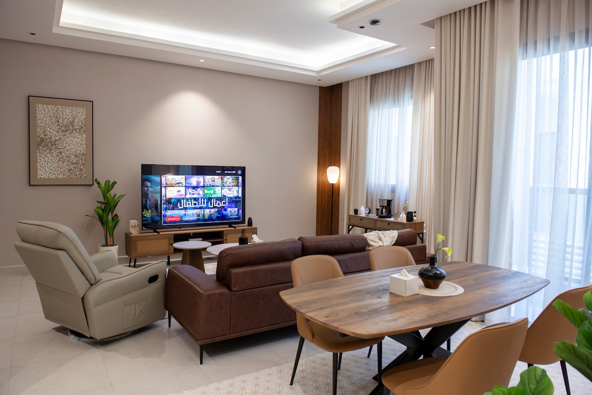 نوفر لك إقامة فريدة وراقية يتم فيها توفير جميع وسائل الراحة التي تستحقها، ونقوم هنا بتوفير وسائل الترفية من اشتراكات Netflix وShahid ، كما تحصل هنا على الخصوصية التامة وتسجيل الدخول الذاتي، في موقع مميز وقريب من جميع الاماكن السياحية والخدمية.