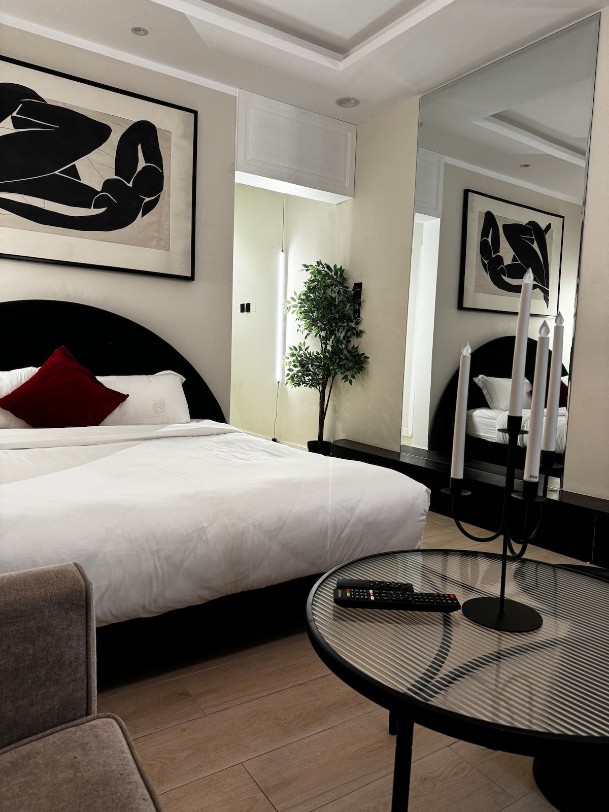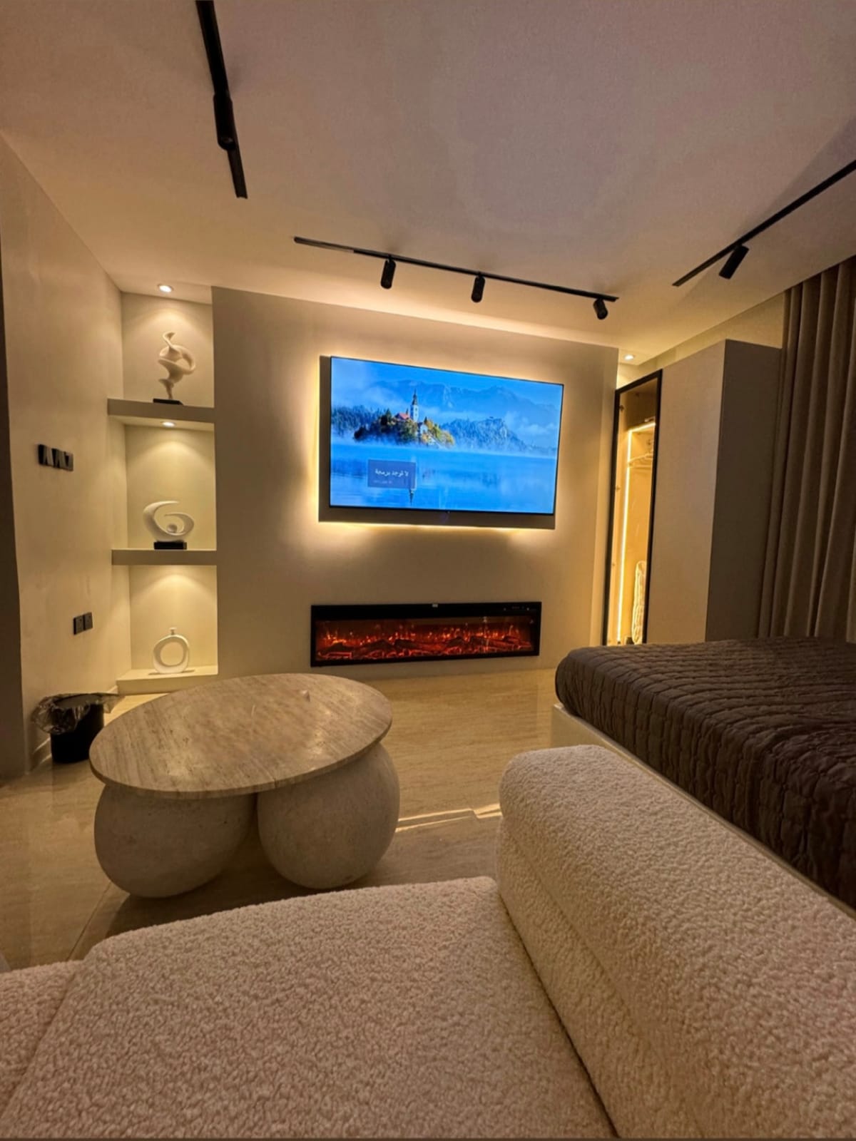 Cozy and luxurious apartment designed by Architect Khaled, located near Boulevard and close to the Financial Center (KAFD). Features a simulated fireplace that adds a warm and inviting ambiance. Includes a bedroom with a comfortable seating area, a stylish dressing room with a uniquely designed makeup vanity, and a spacious wardrobe. The apartment boasts a sophisticated and comfortable design, perfect for modern living.