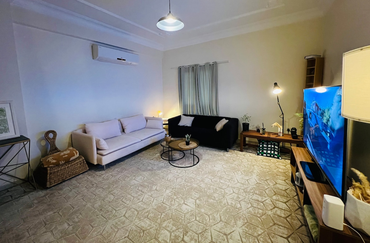 Apartment in villa 2nd floor, with private entrance stairs and patio - Master bedroom: large double bed, wardrobe and a dresser - Bedroom (2): two beds, wardrobe and a dresser - Seating lounge: 55 inch TCL smart TV, Netflix, YouTube, and all other programs. - Fully furnished kitchen with refrigerator, microwave, and cooking utensils - Fully equipped bathroom, there is cloths washing machine - Free Fiber Internet service - The apartment is a full floor with an area exceeding 120 square meters