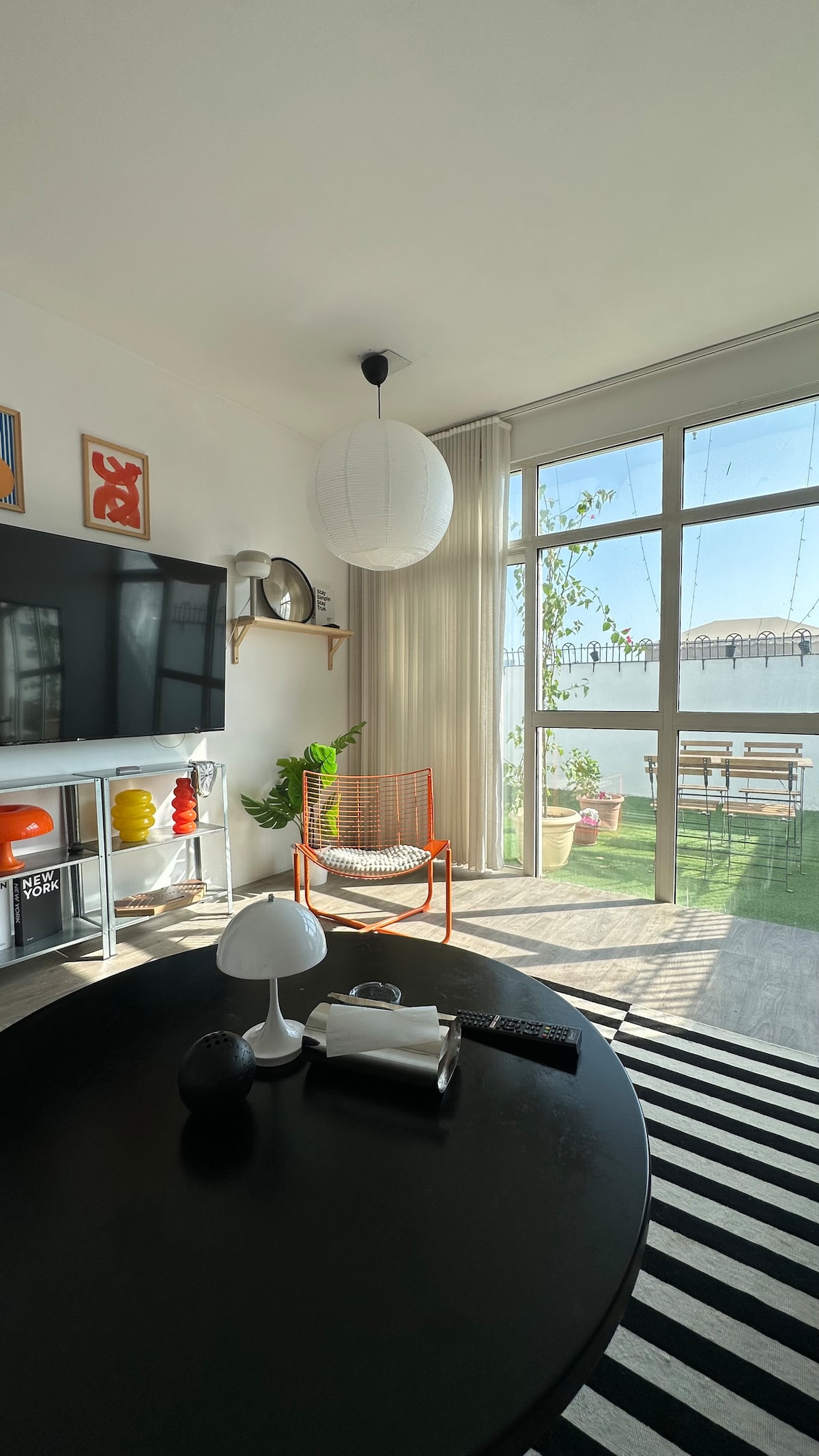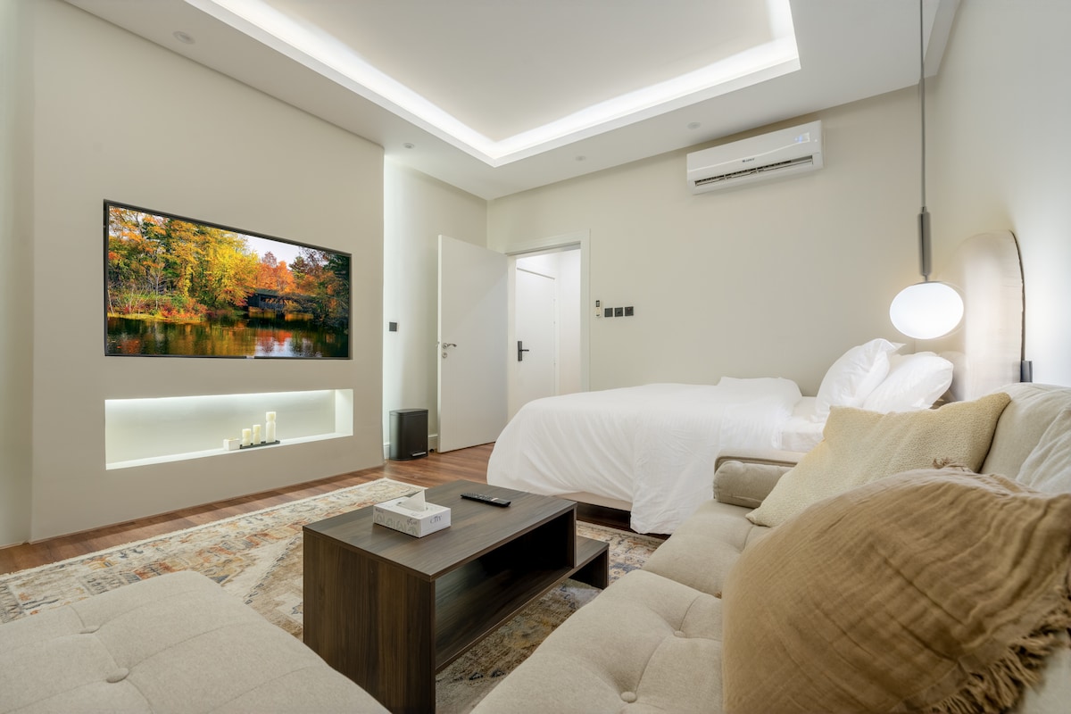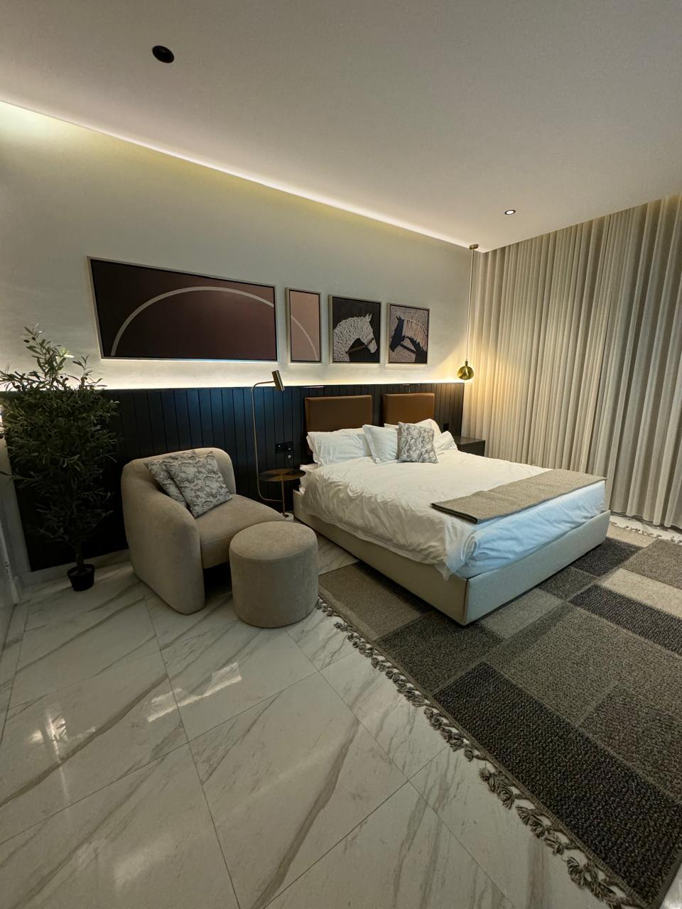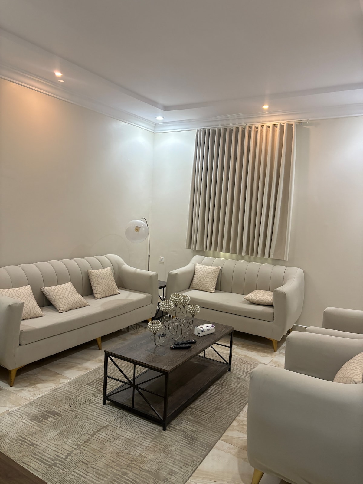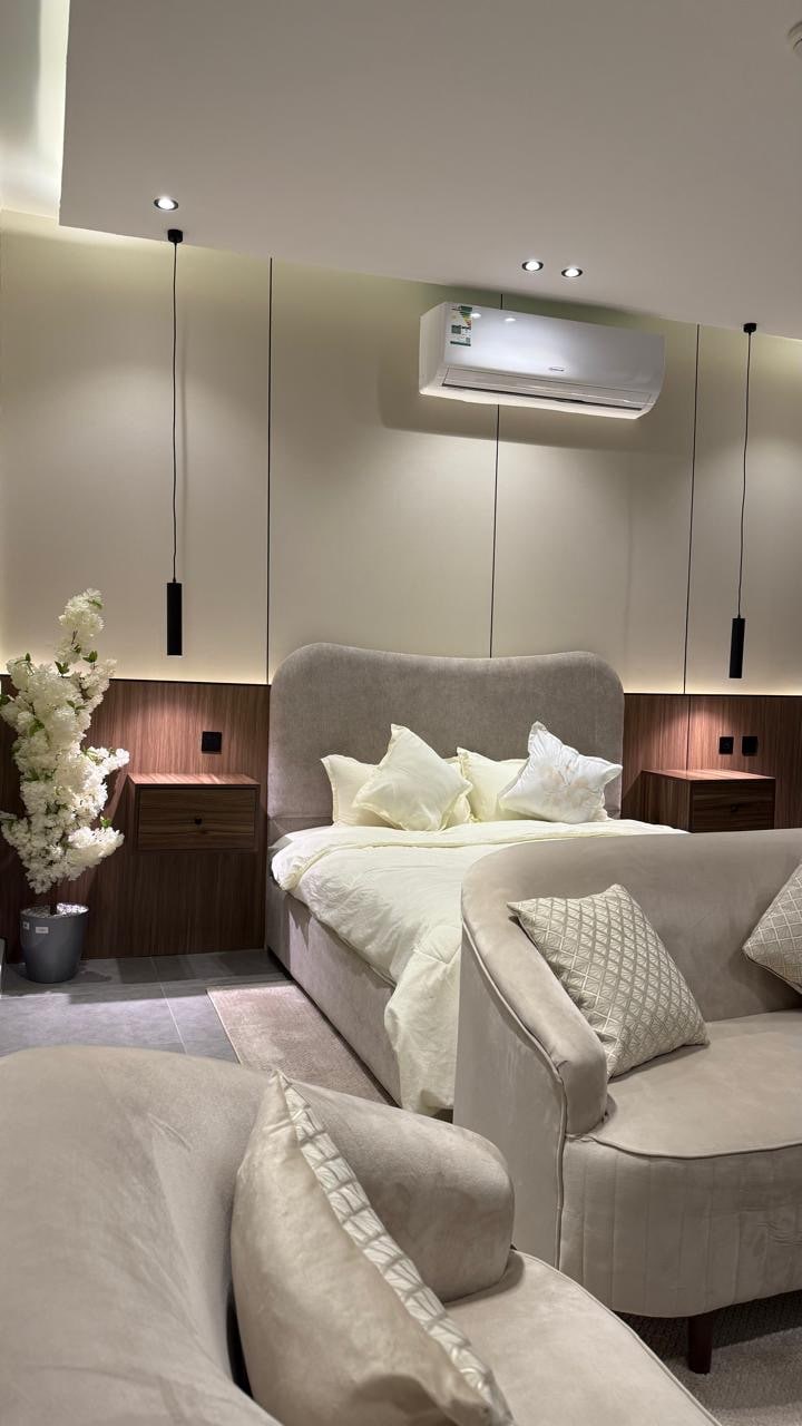 A modern apartment designed for an exceptional stay, located in one of Riyadh’s finest neighborhoods with a stunning view of KAFD. It features an outdoor seating area with a screen and projector for enjoyable evenings. For your comfort, the bed includes a high-quality 14cm extra layer. “We also offer event coordination services for special occasions (including cake and accessories) for an additional fee with prior booking, ensuring an unforgettable experience “