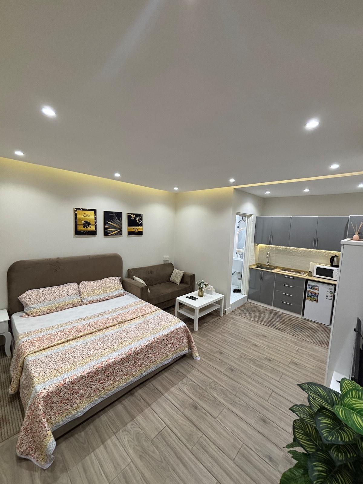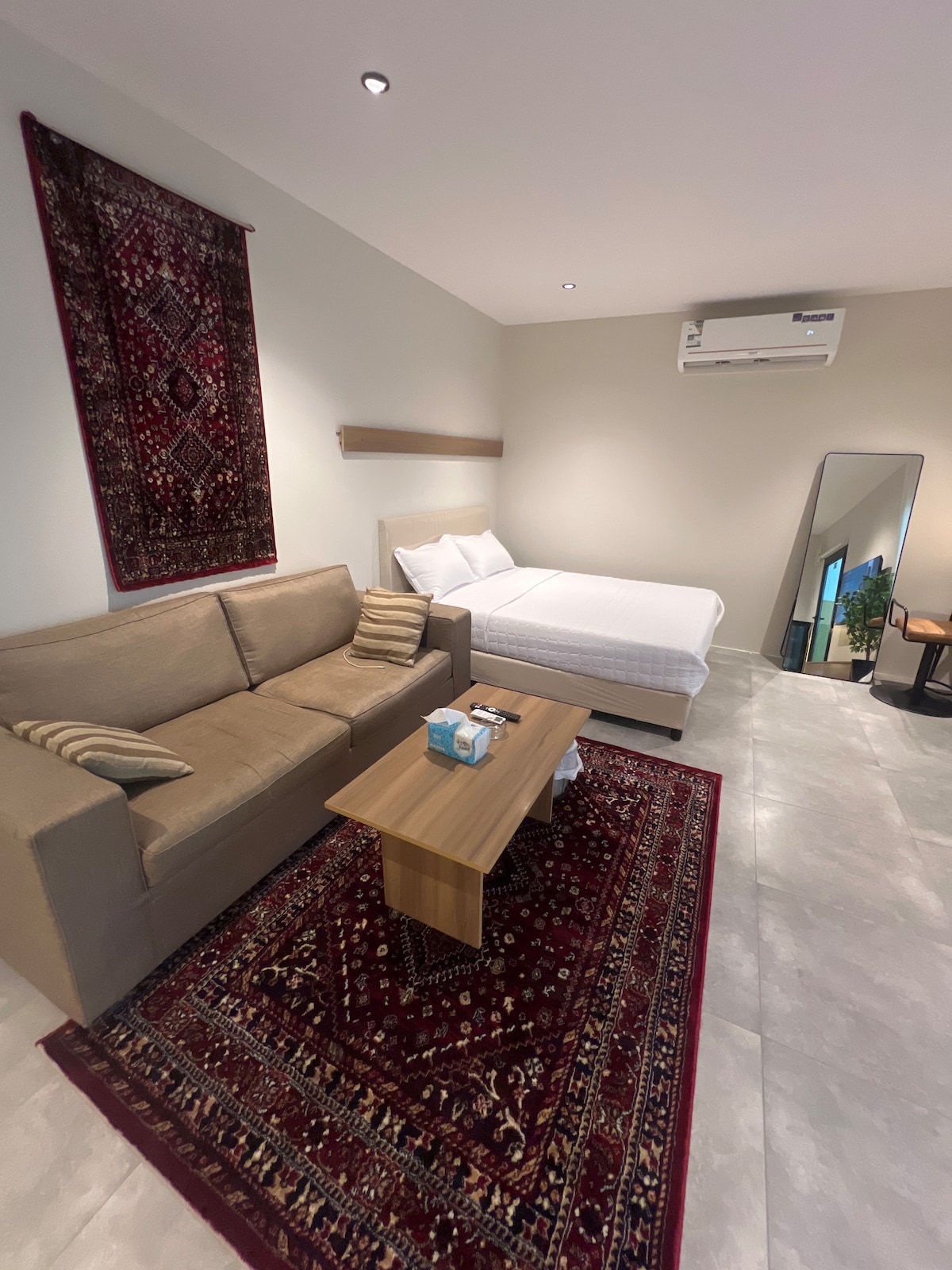 Modern designed penthouse apartment, located in the heart of Jeddah. - The penthouse apartment is located 2 minutes away from Prince Sultan, 4 minutes away from U-Walk Mall. - This modern designed penthouse apartment will meet all your holiday needs. - The apartment offers a fully furnished room, living room area, kitchenette, and bathroom. - The apartment has the essentials of a holiday such as a 70-inch TV, 5G internet, refrigerator, coffee machine, and more.