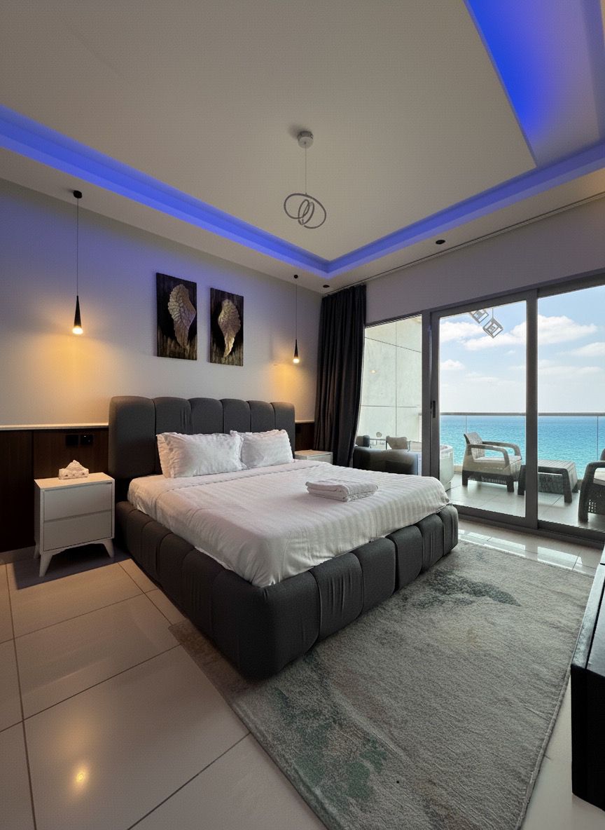 استمتع بإقامة فاخرة على شاطئ البحر! شقة رائعة للإيجار اليومي تتميز بإطلالات خلابة على البحر من كل زاوية. تتكون الشقة من غرفتي نوم مريحتين وصالة، حيث تحتوي غرفة النوم الرئيسية على بلكونة خاصة تطل على البحر، مما يوفر لك لحظات من الاسترخاء والهدوء. والاستمتاع بالمناظر البحرية الساحرة من بلكونة الغرفة الثانية وصالة المعيشة. تتميز الشقة بالأثاث العصري والديكور الأنيق، وتضم جميع وسائل الراحة الحديثة التي تحتاجها. لا تفوت هذه الفرصة لتجربة إقامة لا تُنسى في واحدة من أجمل المناطق على شاطئ البحر.
