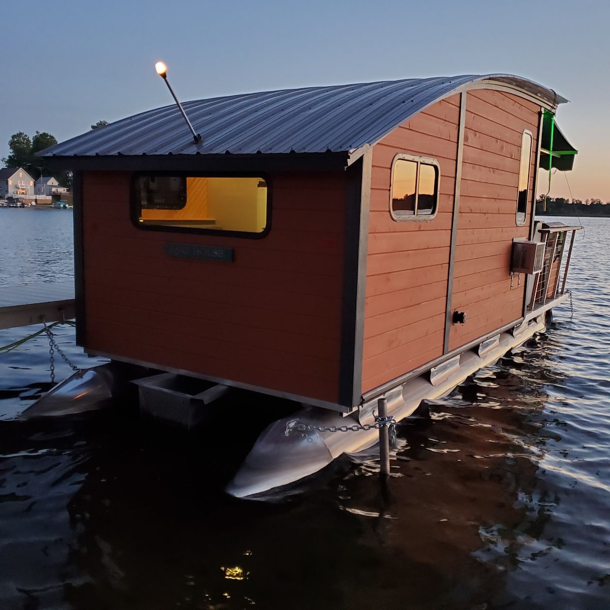 All guests must be 21 or older! Beautifully appointed craftsmanship makes for a luxurious vibe in our houseboat named "RowShell". Clean and pristine, she's perfect for a solo traveler or a couple. Enjoy breathtaking sunsets and morning coffee from the deck. Spring-fed, super clean Big Fish Lake is excellent for swimming and fishing. Rowshell stays docked. 5G WiFi, TV, Netflix, AC, free use of 2 kayaks, firewood, and many other creature comforts. We can't host dogs - no exceptions.