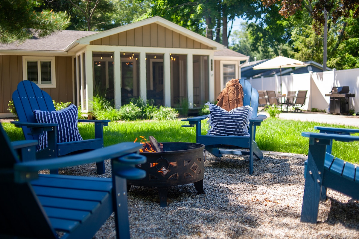 Front patio that holds a hot tub, grilling area, outdoor dining. Main floor- *bedroom with queen bed *Full kitchen *full bathroom with tub/shower *living room *dining room *screen in porch off dinning room and living room Upstairs- *bedroom with king bed *Full bathroom with double sinks and standup shower Douglas- 5mins away Saugatuck- 7mins away Beach access is about 10mins away During summer months we provide beach chairs, cooler, beach towels, beach toys, and beach bag