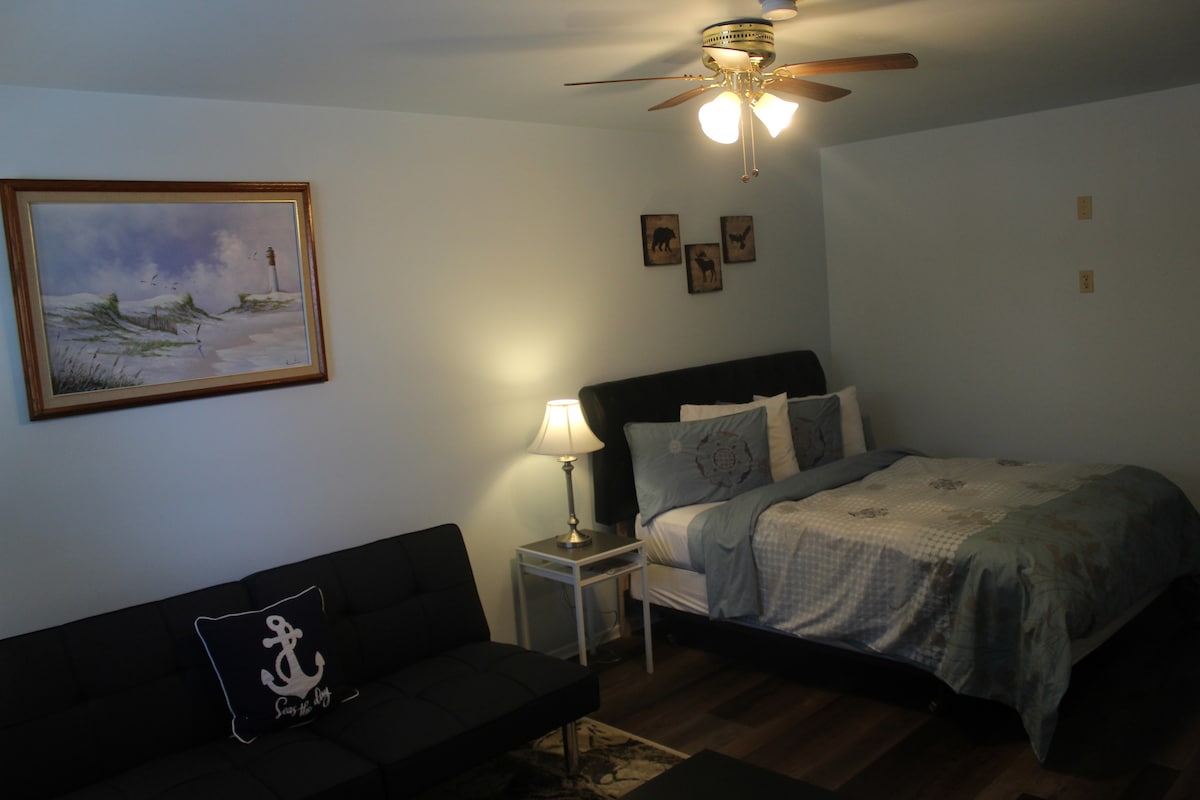 This is a Studio Accessible Apartment Suite with one queen bed, sofa, fully equipped kitchen, accessible bathroom, tv, free WIFI and has easy access from the front entrance. Located in the downtown heritage district of Meaford and within walking distance of the waterfront, shops, restaurants and historical sites. FREE parking on the premises, one per booking.