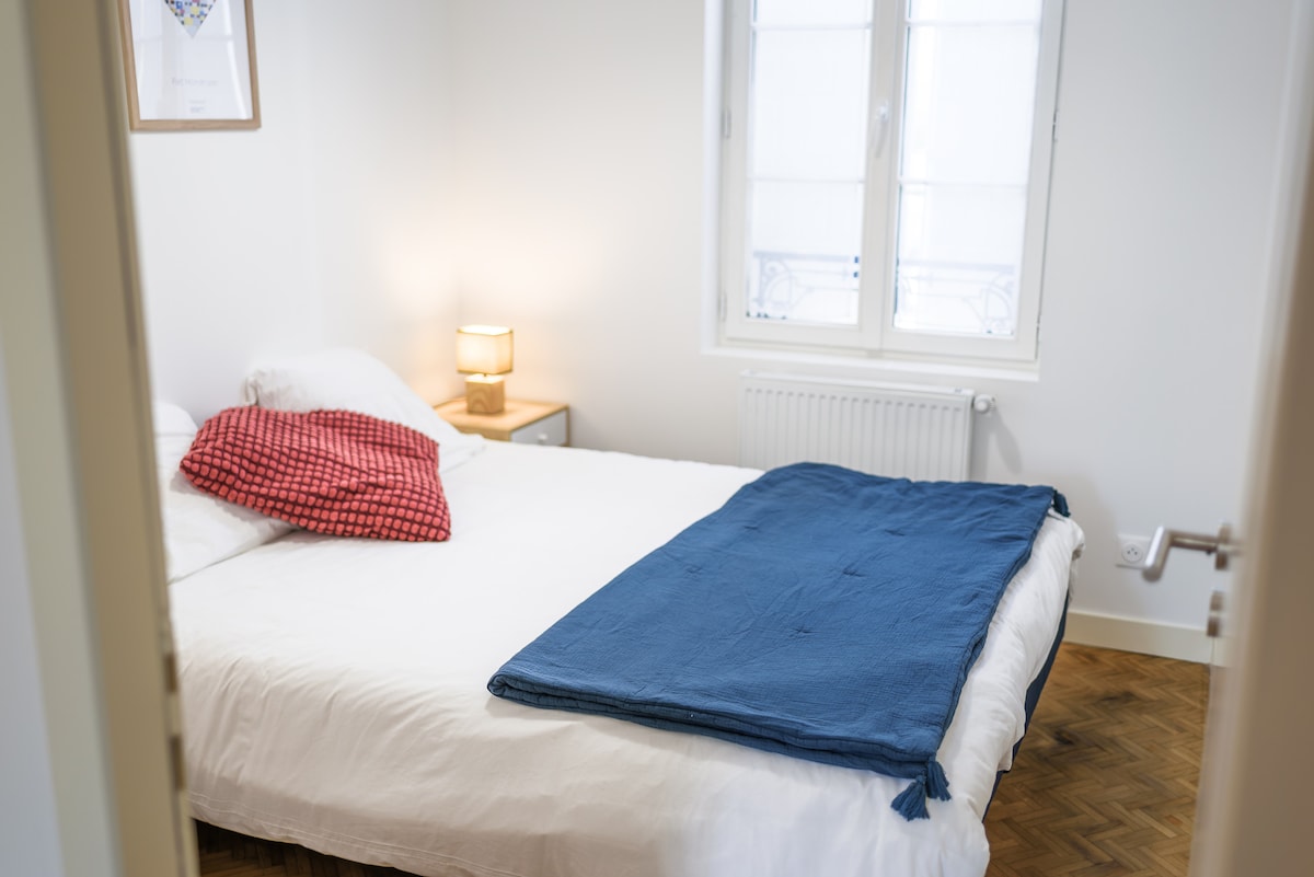 Logement traversant, lumineux, 58m², orienté sud coté salon, nord coté chambre. Il possède 6 grandes ouvertures avec une vue dégagée. Il se situe au dernier et deuxième étage. Stationnement payant dans la rue ou parkings gratuits à proximité. Le WC est séparé de la salle de bain. Le lave linge offre une fonction de séchage. Le lit mesure 160cm/200cm, oreillers et couette en duvet d'oie et de canard. Réduction à la semaine ( 7 nuits ) de 20% Réduction au mois ( 28 nuits ) de 25%