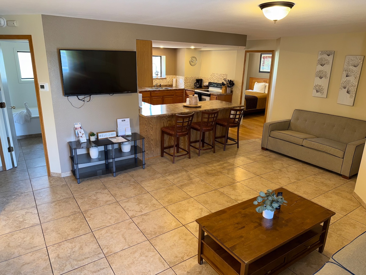 Enjoy comfort and convenience in our Two-Bedroom Suite at Ambers Inn & Suites, just minutes from downtown Wisconsin Dells and the area’s top attractions. This family-friendly suite features two private bedrooms (one king and one queen), a fully equipped kitchen, cozy living area, and a private back patio—perfect for relaxing after a day of exploring. Guests enjoy seasonal access to the outdoor heated pool, indoor hot tub, picnic area, and playground.