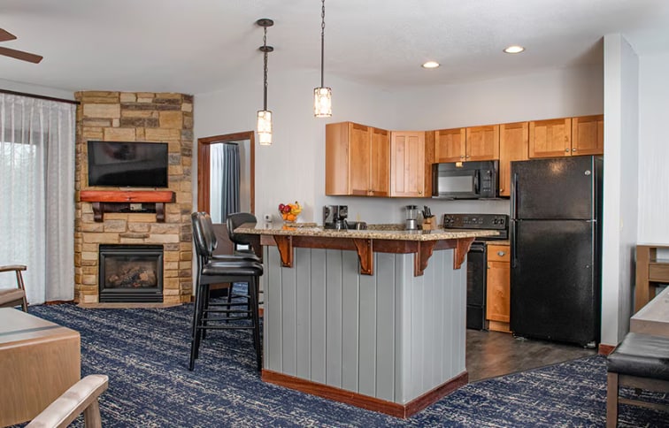 Timber furniture and stacked stone give this resort a rustic, lodge-like feel, complemented with modern accessories. Step outside your door to explore all the water parks and amenities of Wilderness Resort. Glacier Canyon is connected to nine waterparks and four arcades. When you're not busy tubing and sliding, you can enjoy local attractions including wineries, casinos, golf courses, wildlife parks, hiking, and family fun like zip lining, go-karts, and magic shows.