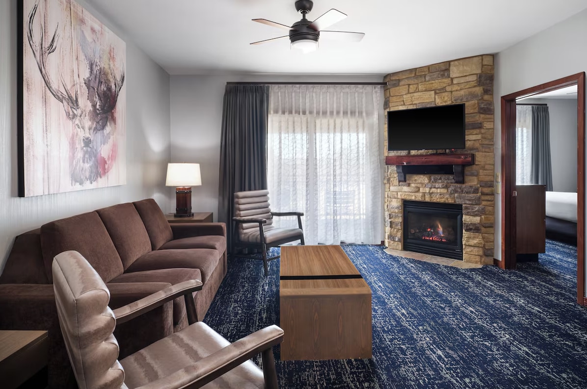 Nestled in Wisconsin's scenic wilderness, Club Wyndham Glacier Canyon blends rustic charm with modern flair, featuring timber furnishings and stacked stone accents for a cozy, lodge-inspired vibe. Just steps away, Wilderness Resort beckons with nine thrilling waterparks, four arcades, and a host of amenities. Discover local adventures like wineries, golf courses, casinos, wildlife parks, hiking trails, horseback riding, carriage tours, zip lining, go-karts, and magic shows.