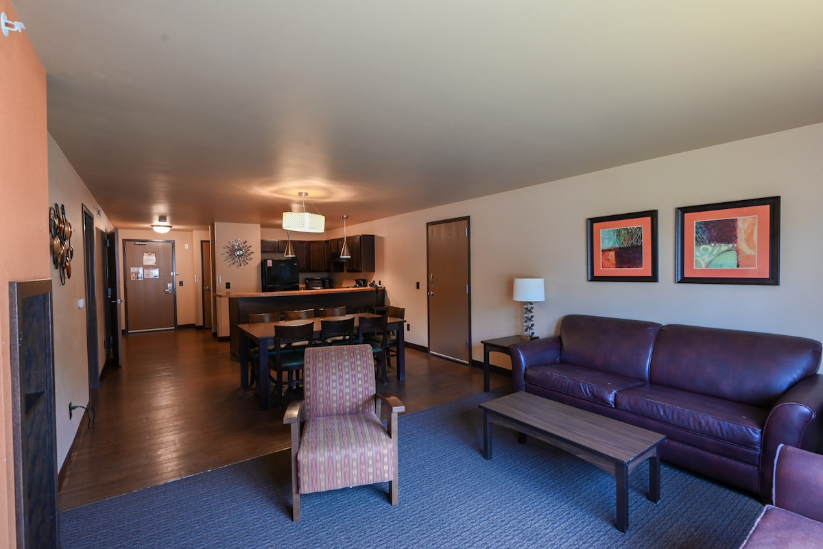 Enjoy comfort and convenience in our Two-Bedroom Suite at Ambers Inn & Suites, just minutes from downtown Wisconsin Dells and the area’s top attractions. This family-friendly suite features two private bedrooms (one king and one queen), a fully equipped kitchen, cozy living area, and a private back patio—perfect for relaxing after a day of exploring. Guests enjoy seasonal access to the outdoor heated pool, indoor hot tub, picnic area, and playground.