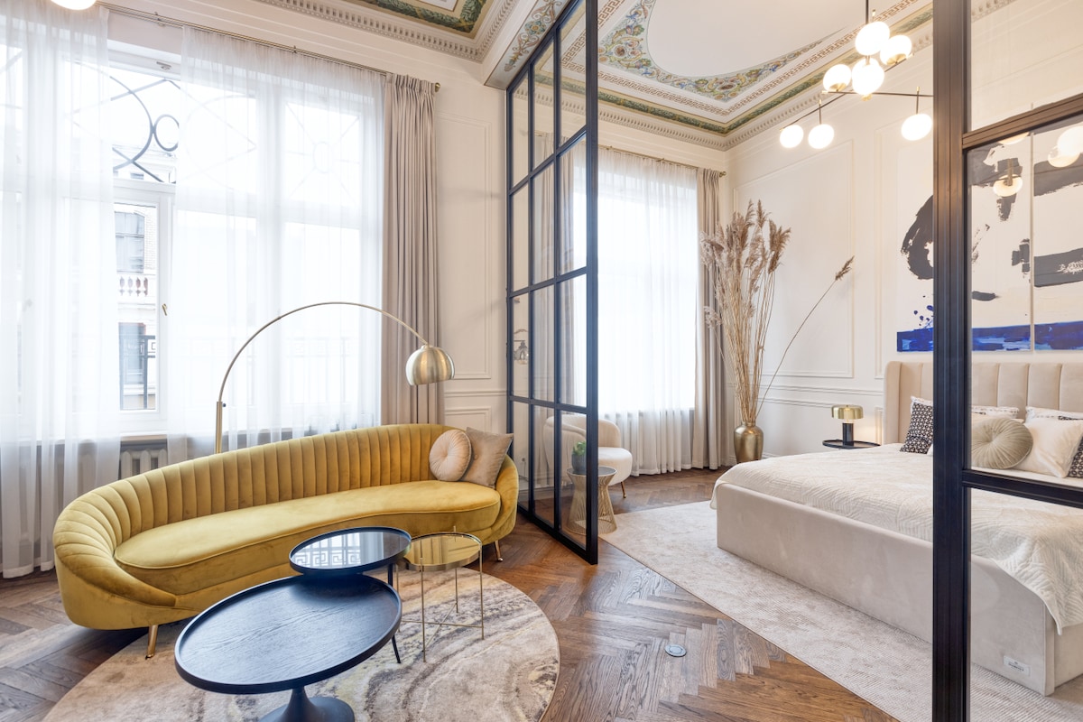 Enjoy a comfortable stay in this thoughtfully designed one-bedroom apartment, set in a historic 1930s Modernist building. Carefully renovated to preserve its original charm, the space is bright, inviting, and enriched with artwork by talented Latvian artists. Whether you're visiting Riga for work or leisure, this apartment offers a warm and well-equipped home base—perfect for solo travelers, couples, or parents with a baby.