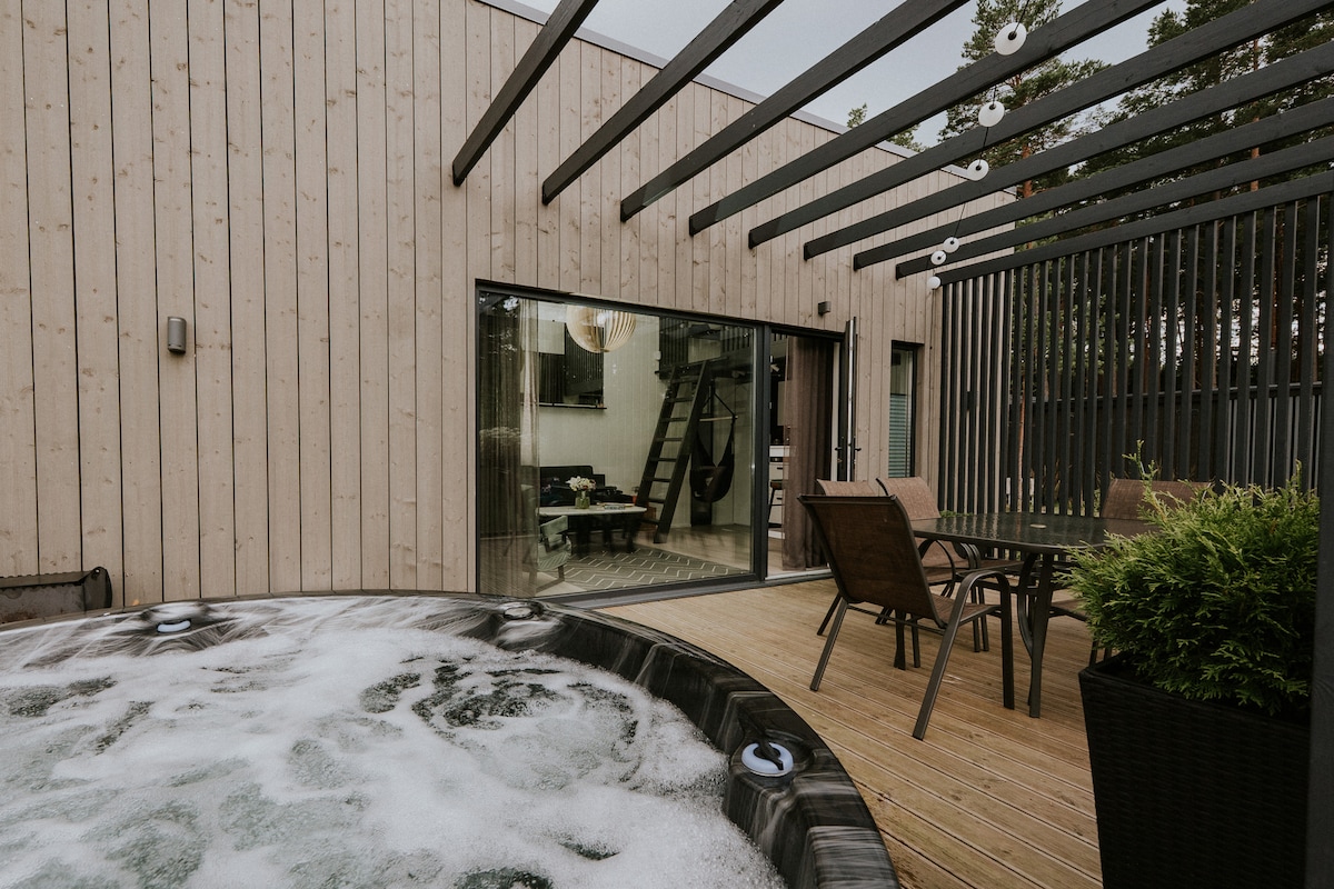 A cabin for two to enjoy the nature and the nearby sea (900m walk from a sandy beach), located 28km from Riga, just outside of the town Saulkrasti. Wide windows to enjoy the scenic surroundings, and in the evenings you may choose to opt for our recreational options (at an additional fee) - an outdoor hot tub and a sauna (hot tub 60€, sauna 60€, sauna with traditional sauna whisks and a body scrub 80€). The place can be reached on foot from the nearby train station or bus stops, or by car.