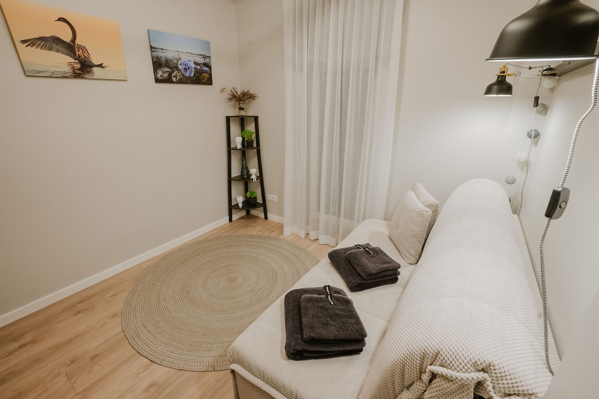 All season retreat house for a couple or a family with up to 2 children. Made with love, the best materials and care to wellbeing. Surrounded by wild berry fields and a pine forest. Peaceful and very relaxed neighbours, that offer options for outdoor sports. 5 min walk on a lovely street leads to the sea : white dune, pedestrian roads and hiking trails. 5 min walk in the other direction leads to Rimi and Top grocery stores and the train station. 10 min walk to the local market every Friday.