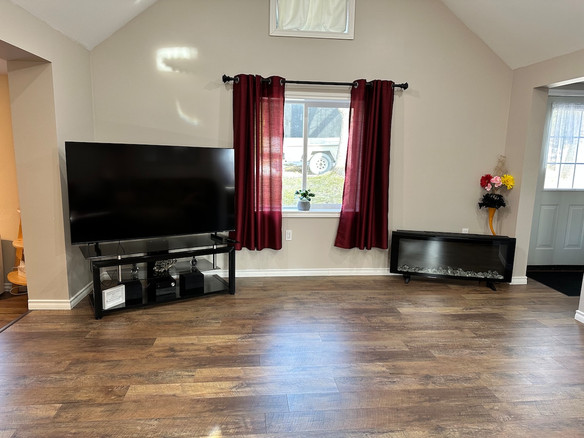 Enjoy this entire 3BD, 2BT house, perfect for families or solo travelers. Scan the QR code in the photo gallery for a video tour! Amenities include: - A luxury 7-person hot tub - Barbecue (unlimited gas line) - Unlimited free EV charger (Tesla compatible) - Dedicated workspace - 6 TVs including a 75-inch 4K smart TV - All major streaming services - Playstation 5 with games - A full kitchen - Laundry washer & dryer - High-speed Bell Fibe Wi-Fi - Alexa controlled lighting - Backyard fire pit