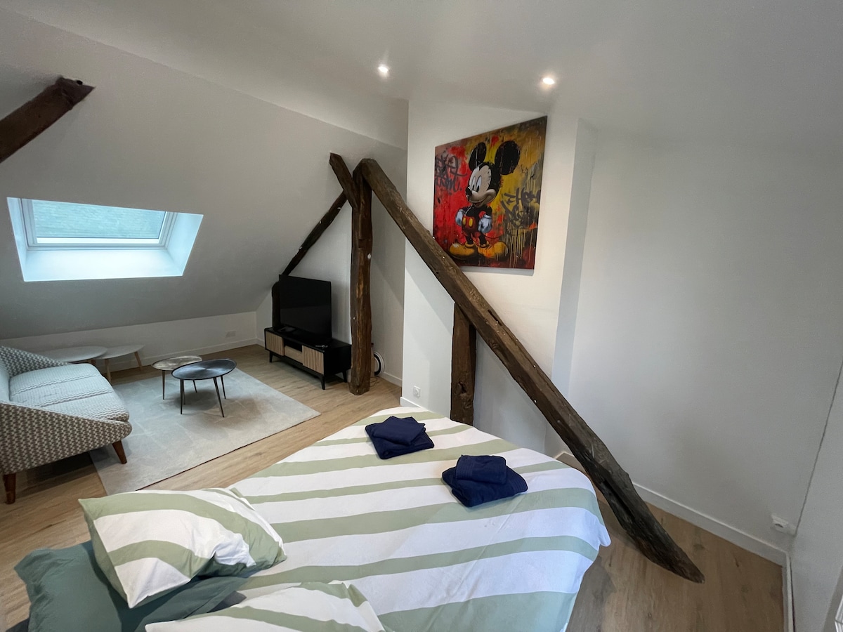 Studio de 25m2 refait à neuf, très lumineux situé à côté de la place St Pierre (restaurants, boulangerie, commerces et marché le samedi matin) dans une rue calme du centre historique et à côté du château de Saumur. Il est au 2ème étage d'un immeuble de standing en tuffeau/bois. Parking des remparts gratuit à 70m. Très bon réseau 4G, box avec fibre. Composé d'un séjour (canapé lit)/cuisine équipée et salle d'eau séparée avec douche et wc. Draps, serviettes, produits de première nécessité fournis.