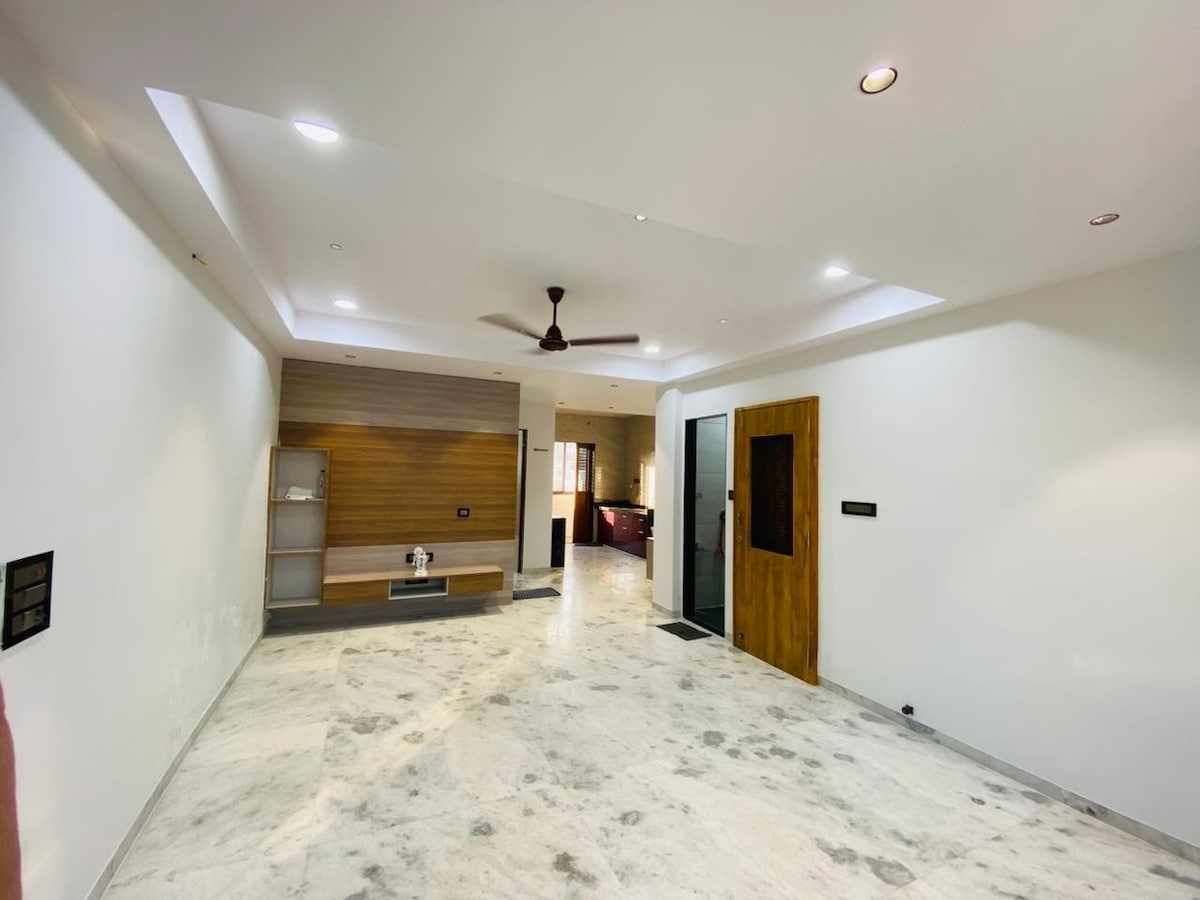 This stylish 2 BHK villa in GIFT City, Gandhinagar, is perfect for families or small groups of up to 9 guests. It features fully air-conditioned bedrooms, a Rajwada-themed living room with 2 ACs, and 3 modern bathrooms. Enjoy the private garden, kids’ play area, and a beautiful swimming pool. Located in a peaceful, well-connected area. Total 2 acre land with 500 fruit and flowers tree care taker house is attached. Farm house 💸 ₹2500 for 1 guests, ₹500 per extra guest (payable on-site).
