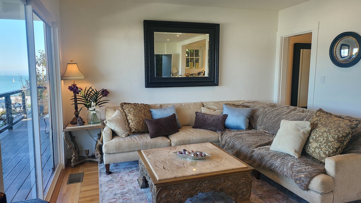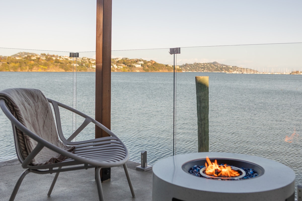 Romantic floating condo with breathtaking water views. Relax & enjoy a tranquil escape in style and comfort. Catch the sunrise from your super comfie bed or lounge on the deck with occasional pelicans (or even a seaplane) coming and going. Unique and perfect for a getaway, workacation, or retreat. Golden Gate Bridge is 6 min away. Airport bus stops a block away. Walk/bike path to Sausalito & Mill Valley. Ferry/bus to SF. Free parking Read reviews of this or our 3 other floating condos!
