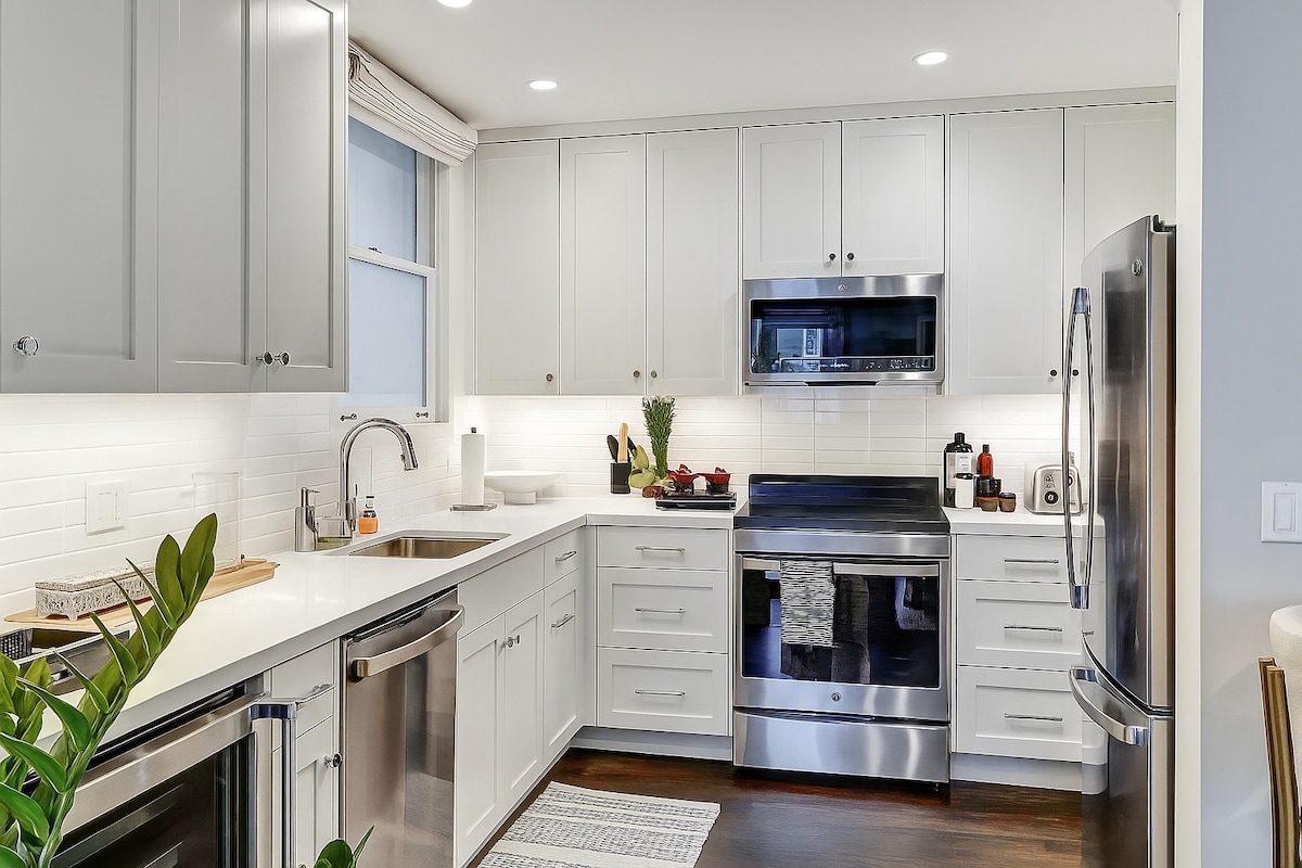 Experience SF in style from this beautifully renovated studio, located in a quiet corner building in Pacific Heights—just a short walk to Fillmore Street. Brand-new appliances, full bath, washer + dryer, and a private entrance. 50" HDTV w/premium cable and Sonos system. In-home gym setup, complete with a weight bench, free weights, kettlebell, and yoga mat. Perfect for couples or business travelers seeking a modern, fully equipped retreat with all the comforts of home and a prime location.