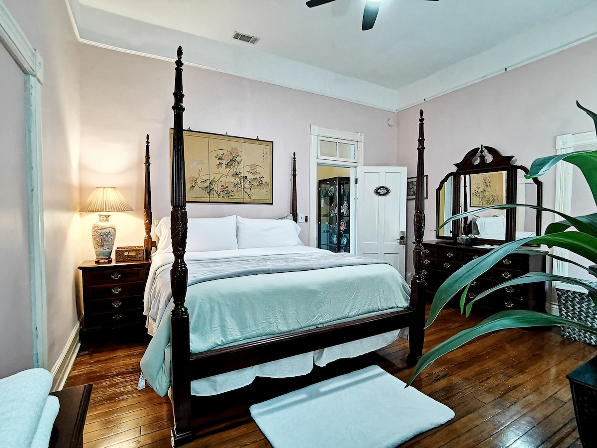 Welcome to our whimsical top-floor condo overlooking Bay St! This spacious 1BR/1BA retreat in an 1857 building that feels like you've been pulled from the pages of a fairytale! Enjoy the romantic views of the massive live oaks below sprinkled with Spanish moss, a fully equipped kitchen, and a comfy and fresh living room (with pull-out sofa for an extra guest!). The huge bedroom features a luxurious king bed. This space will be your home base for a most memorable trip to Savannah! SVR-02997