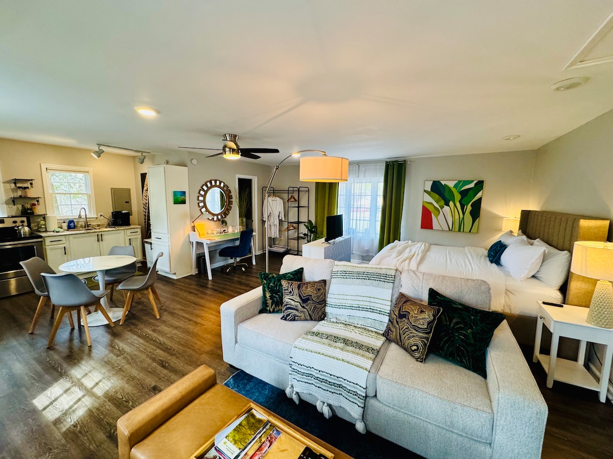 Peaceful treehouse on Wilmington Island. loft39 is a one-bedroom studio apartment, a stylish escape from the downtown Savannah area. Relax in the tree canopy in a spacious private apartment with luxury bedding on a king size bed, high speed WiFi, 2 smart TVs, dedicated workspace, fully equipped kitchen with bar amenities, fully tiled bathroom with oversized shower, separate living and dining areas, and beach supplies! Private off-street parking included. License # OTC-023656