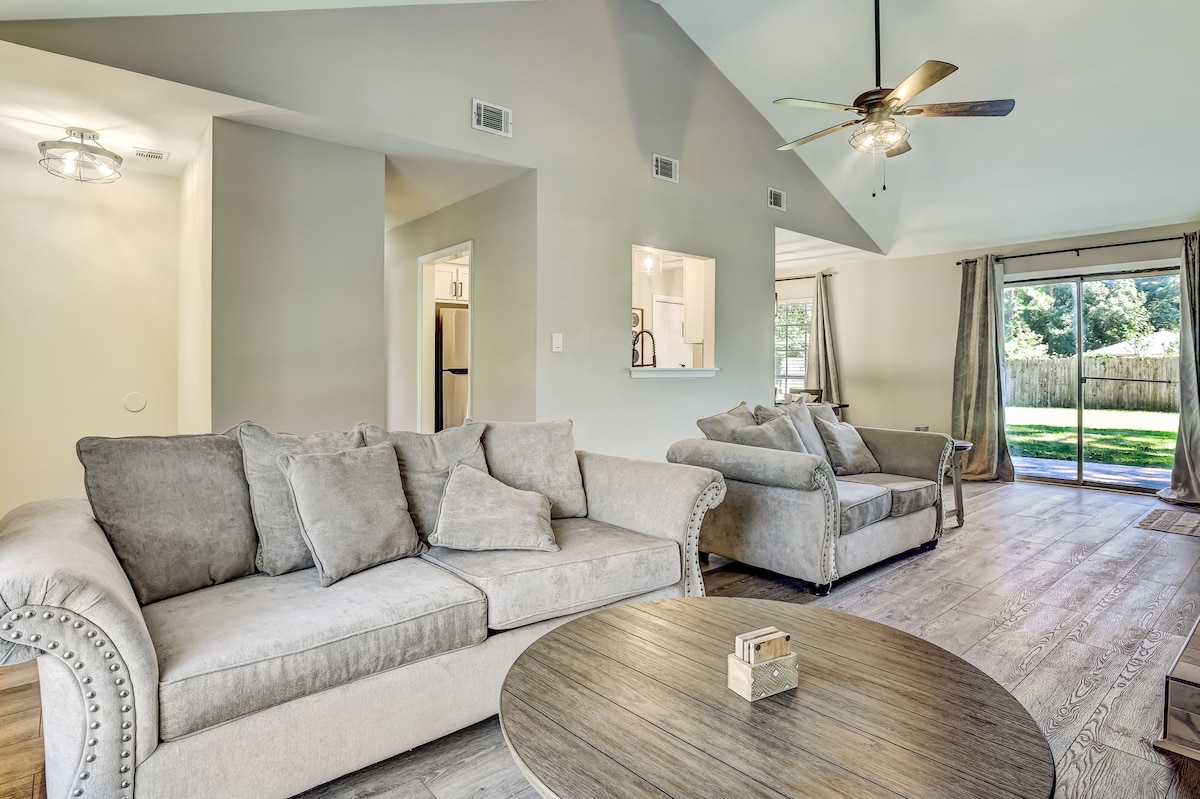 The Pinterest-worthy retreat for your group in a quiet peaceful neighborhood just outside of Savannah. Spend time in the backyard playing outdoor games or relaxing under the pergola. Move inside to enjoy the spacious, mid-century modern design throughout the living spaces and bedrooms. Kitchen is fully stocked so you can cook if you want! We are just minutes from Savannah Airport & Pooler, 20 minutes from downtown Savannah, 45 minutes from Tybee Island and 50 minutes from Hilton Head.