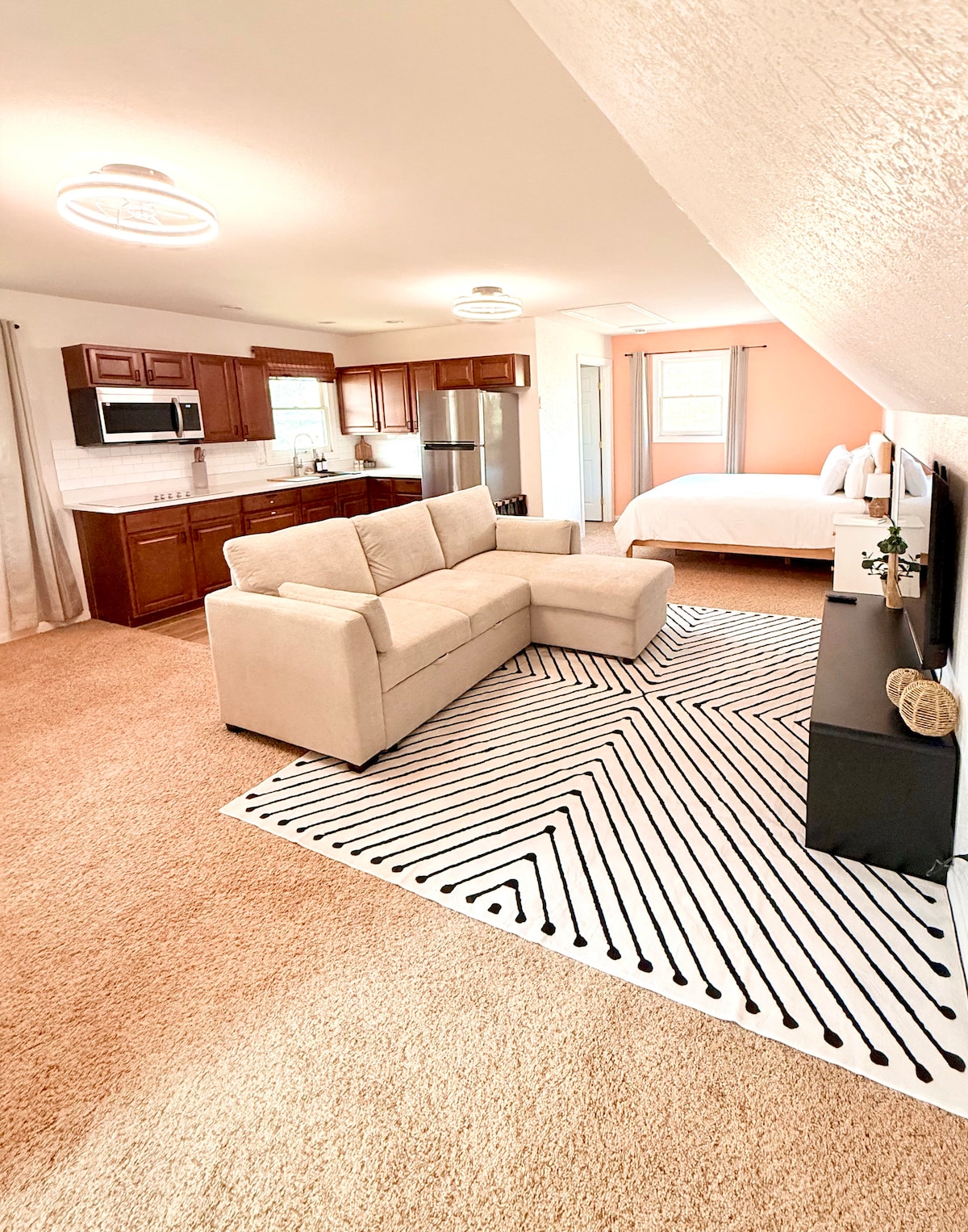 The SkyLoft is a 2nd floor studio (with stairs) accessed via the gravel lane behind our house with in-door garage parking. Featuring a queen bed, rain shower w/ a Rinnai tank-less water heater, Berkey water filter system, and private patio seating. The enclosed parking is shared with Brian and Jen, we live in the main house with our two pups, Luna & Simon. We respect your privacy and you'l only see us on an occasional passing. We're happy to answer questions to help with your visit in Savannah.