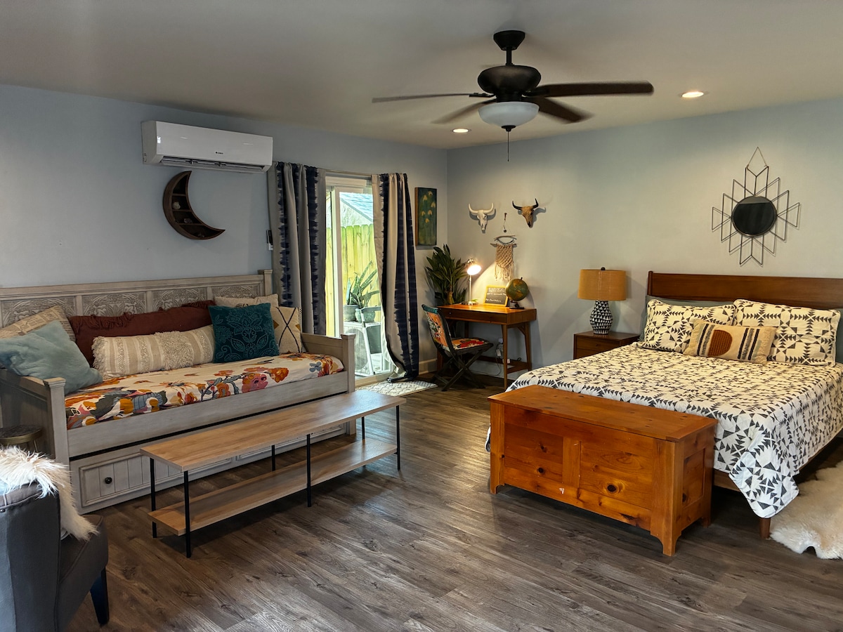 Nestled in Savannah’s historic Streetcar District, The Garden Studio at Half Moon House is a private retreat within the city, blending funky, mid-century modern style with a rustic cabin feel. This open-concept space features a kitchenette w/ essentials, an extra-long clawfoot tub w/ hand shower, and floor-to-ceiling windows overlooking a peaceful garden. Set in the historic carriage house behind a 1914 colonial revival home, it’s just minutes from Forsyth Park, Starland, and top restaurants.