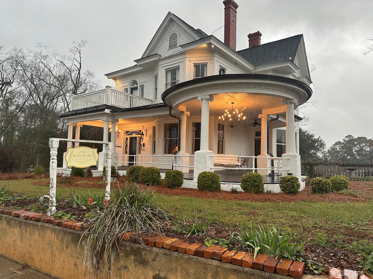The Queen Suite at The Rosemary is a spacious and beautifully appointed room overlooking the tranquil koi pond and pool, creating a peaceful and picturesque setting for your stay. Large windows allow in plenty of natural light, giving the room an open, warm, and inviting feel. The bathroom is located directly across the hall from the Queen Suite and is shared only with the Blue Room on this floor. This suite offers comfort, charm, and relaxing atmosphere .