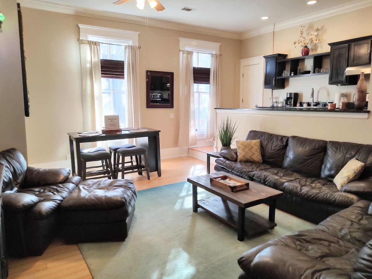 Enjoy our peaceful and spacious condo, perched on the second floor of our historic Savannah estate, just steps away from Forsyth Park! This 1-bedroom, 1-bathroom condo (with a convenient pull-out sofa, great for your extra guest!) is the perfect home base for your Savannah stay! Fully-equipped kitchen with all the amenities, cozy and comfortable living space with flat screen SmartTV, fast WiFi, and the cherry on top...a HUGE private balcony! SVR 01789