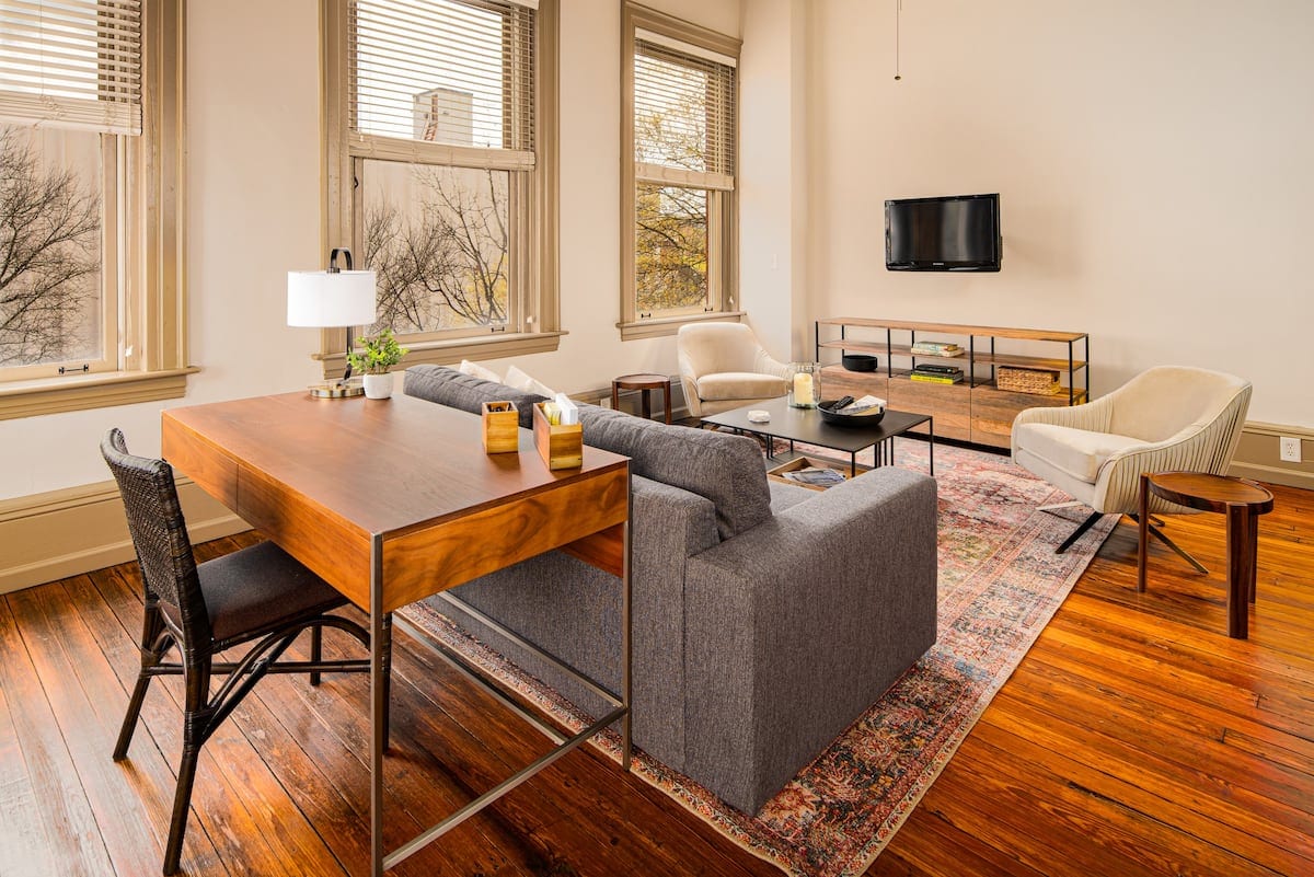 Located in the heart of Downtown Augusta just steps from the areas best food, entertainment and shopping, this 1,100 sq.ft. modern rustic loft offers a fully equipped kitchen with coffee bar which opens to a grand dining and living space anchored by a built-in media center with fireplace. The highly reviewed king sized guest suite is full of amenities to leave you well rested and ready for the day. Whether you’re staying for work, play or both, you’ll have this spot on your list to return too.