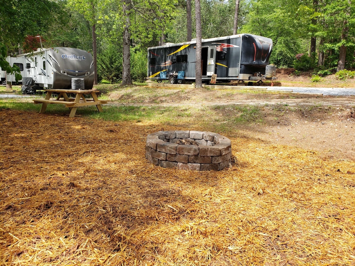 Located just 30 miles from the sites of Savannah, our spot is prime for both exploring adventures in the hostess city while enjoying the simple comforts of country living. Nestled beyond an oak lined entrance, your private space tucked away at the back of 1.60 acres of wide open space awaits you. Expect mornings with the eastern blue birds and robins and count on relaxing evenings inside the state of the art RV on the fireside recliners or outside by the flames of the crackling fire pit.