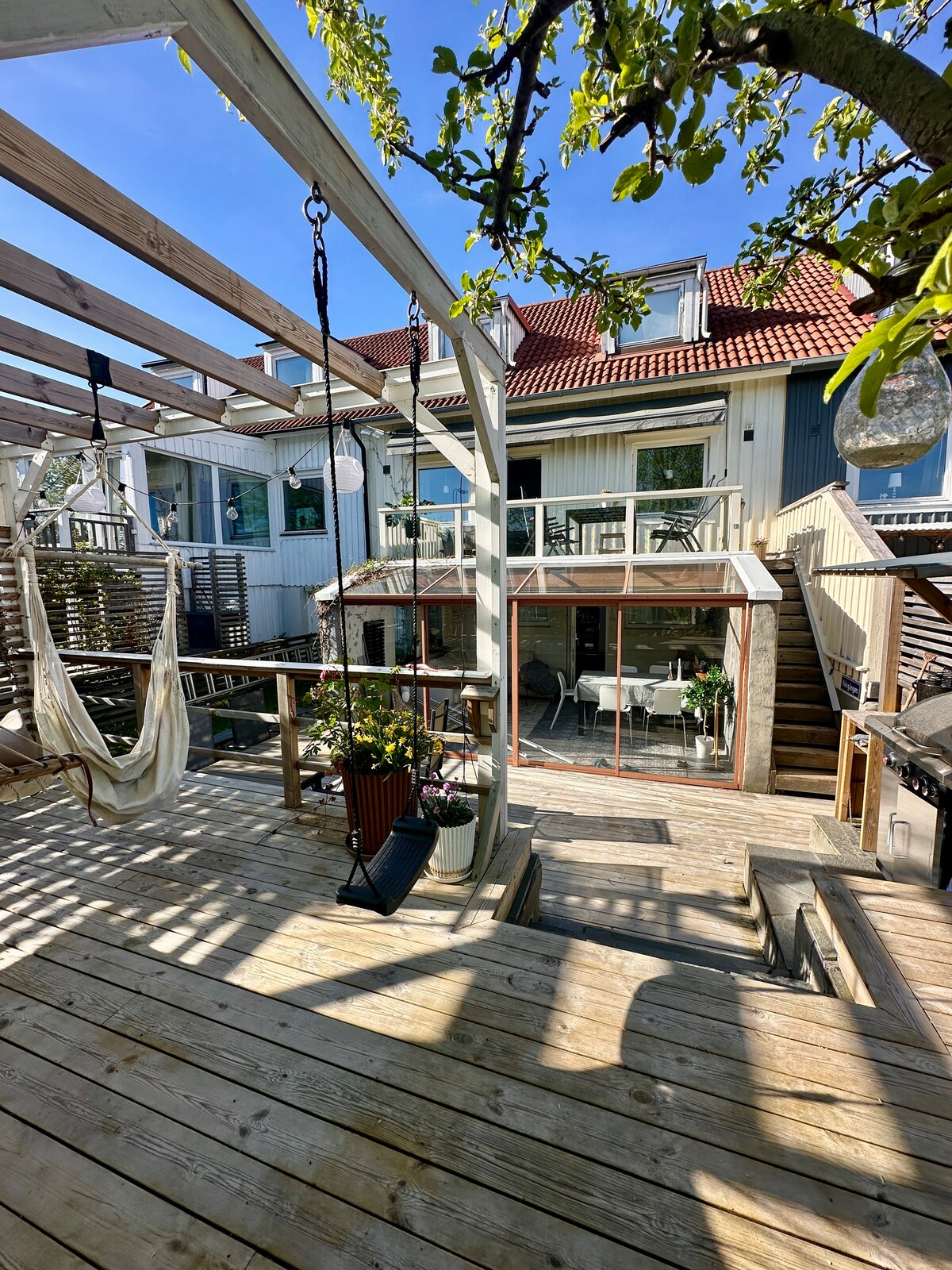 Detta rymliga trevåningshus som ligger strax utanför Göteborg har närhet till både skog och sjöar. På framsidans altan njuter du av kaffe i morgonsolen, på baksidans altan har du kvällssol. Här får du gärna låna grillen om du vill. Detta är ett perfekt boende för de som vill ha närheten till Göteborg, men ändå kunna njuta av lugn och ro. Motionsrundor finns i skogen bredvid och även närhet till bad och shopping.