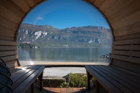 Charmante maison avec vue splendide sur le lac du Bourget dans toutes les pièces, pour profiter du calme, à l’écart de l’agitation de la plage principale. JUILLET ET AOÛT et Vacances Noël / Jour de l’an : 7 NUITS MINIMUM DU SAMEDI AU SAMEDI Elle est au bord du lac d’Aix-les-Bains et au centre du village de Conjux (73310), rénovée, équipée et aménagée avec goût. De 120m², permet d’accueillir jusqu’à 9 pers, située à 70 mètres à vol d’oiseau du lac, avec une petite plage juste en contrebas.