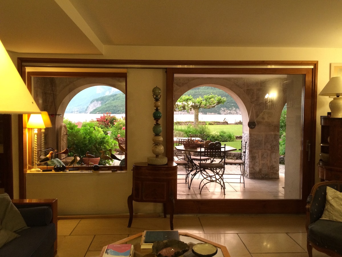Appartement 100m2 indépendant au rez-de-chaussée d'une grande villa, tout confort, décoré par la propriétaire . Panorama exceptionnel au bord du lac d'Annecy, dans le petit village de Duingt, les pieds dans l'eau, Un ponton sur le lac pour se baigner. Propriété fermée (portail coulissant) Très calme. 2 chambres avec lit double et vue lac. 1 pièce avec canapé convertible 2 places en appoint