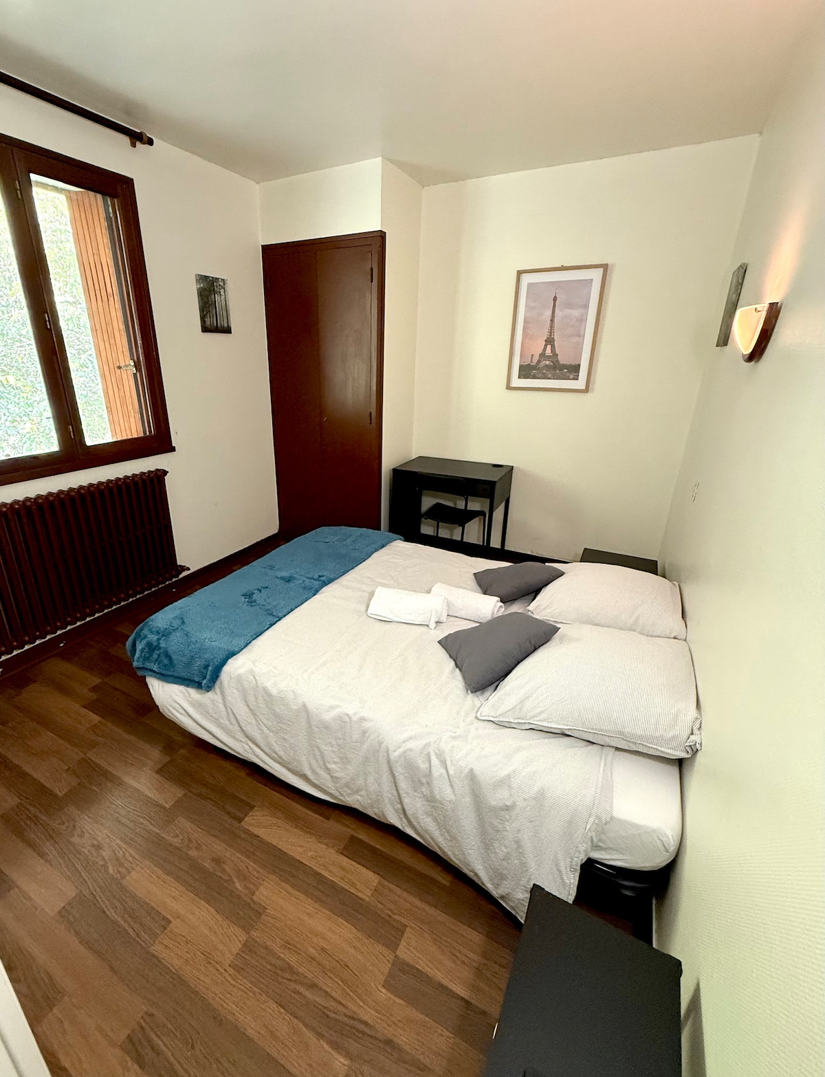 Vous adorerez le décor élégant de cet hébergement moderne. Chambre de 13m2 au troisième étage (sans ascenseur) avec lit double 140 cm, salle de douche et wc. Un bureau complète le lieu pour travailler ou prendre son petit déjeuner. Un mini réfrigérateur, une cafetière Tassimo sont également présents. Une connexion wifi est disponible sur place mais parfois celle-ci est lente. Le bâtiment est composé de plusieurs chambres équivalentes.