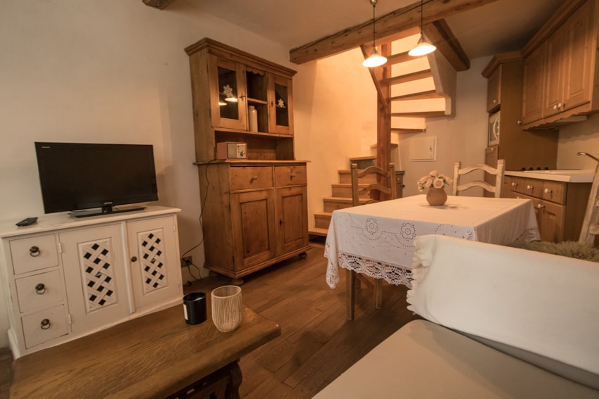 L'appartement est composé d'un hall, d'une SDB + wc, d'une pièce à vivre (cuisine et canapé convertible) ainsi qu'une chambre avec lit parapluie. Pour accéder à celle-ci, il faut passer par la pièce à vivre. Une terrasse située devant l'appartement permet de manger dehors en face de la Meije. Une barrière protège du ravin mais les enfants en bas âge doivent rester sous la surveillance des parents. L’appartement au-dessus est occupé régulièrement par les propriétaires.