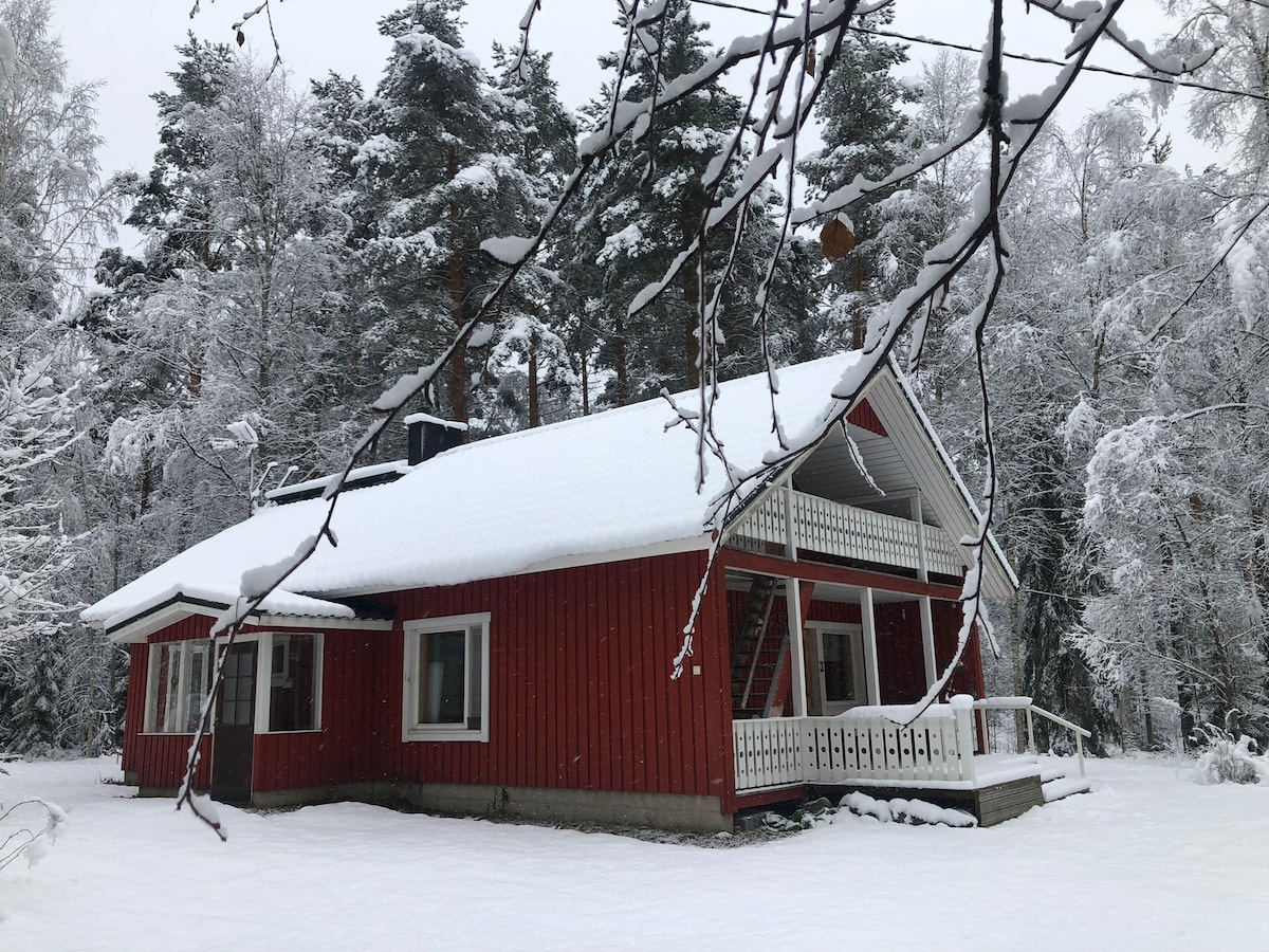 Spend your vacation with friends and family, or a romantic weekend with your loved one by the fireplace, surrounded by beautiful wildlife. A small and cozy house in the forest is waiting for you. There is a sauna, a wood-burning fireplace, a fully equipped kitchen, a washing machine, a sofa on the ground floor (accomodates 2 people ), a double bed and a single bed on the first floor, linen is available, wi-fi. The nearest lake is a 13-minute walk through the forest along a beautiful path.