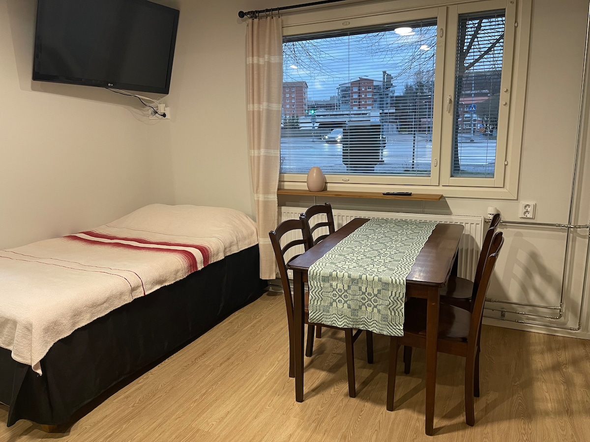 Huoneisto entisen kyläkoulun suojaisassa päädyssä. Huoneistossa tupakeittiö, avoin makuuhuone ja kylpyhuone. Makuupaikka neljälle. Parisänky makuuhuoneessa ja levitettävä sohva olohuoneessa. Huoneistossa on opettajan koroke ja ulkoportaat, ei ole siis esteetön. Ulkosauna lämpenee lisämaksusta. Asunto sijaitsee rauhallisella alueella, 8km keskustasta. Muu osa rakennuksesta on majoittajan omassa käytössä. Pihalla on tilaa oleskella ja esim. grillata. Sopii hyvin myös lapsiperheille.