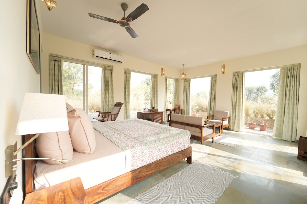 Zaalim, Ustaad and Fateh are 800 sq ft 3 private pool villas at Rann Baagh,crafted for exclusive luxury. Named after Ranthambore’s legendary tigers, they reflect power, grace and wild grandeur. Each villa offers a king bed, modern amenities and a private pool, creating a serene, indulgent escape where wilderness meets refined comfort in a truly elevated stay experience. These villas honour their namesakes’ spirit, offering privacy, space and a deep sense of connection to Ranthambore’s wild soul.