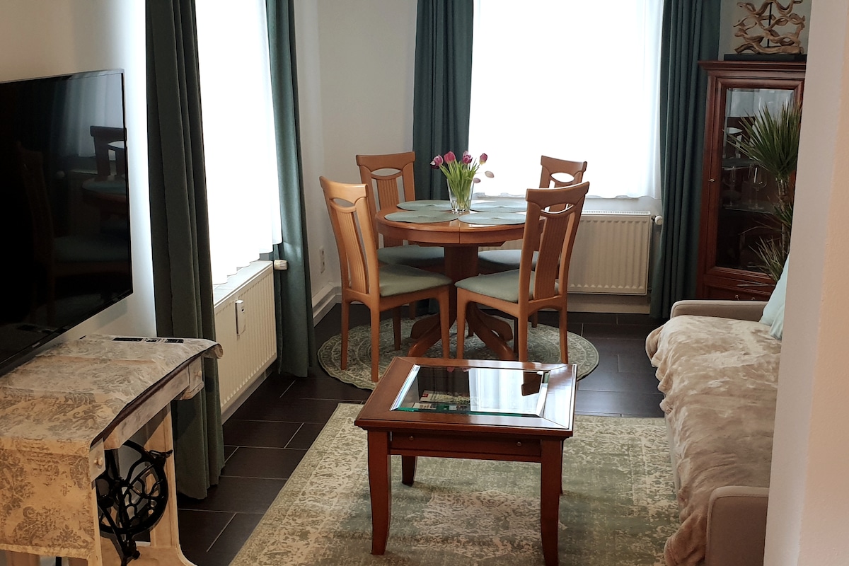 Hab Spaß und erholsame Urlaubstage in dieser neuen 65 qm Unterkunft. Vollständig eingerichtete Küche , Bad mit Dusche sowie ein Schlafzimmer mit Doppelbett (Aufbettung für ein Kind auf Anfrage möglich) Wohnzimmer mit TV, Radio und kostenlosen W-LAN warten auf Dich. Die Wohnung hat einen separaten Eingang und liegt im Erdgeschoss. Großflächiger Garten /Terrasse sowie Spielplatz /Sitzecke können mitbenutzt werden. Parkplätze / Fahrradabstellmöglichkeit vorhanden. Haustiere auf Anfrage möglich.