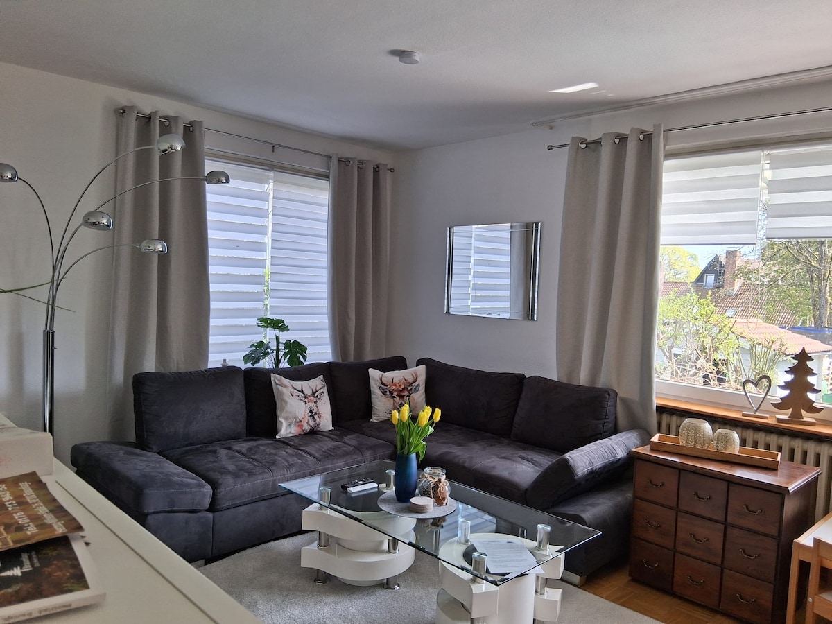 Unsere gemütliche und beliebte Dachwohnung steht wieder für Gäste zur Verfügung, nachdem ich sie ein Jahr selbst bewohnt habe! Die Wohnung verfügt über zwei Schlafzimmer und hat zusätzlich eine Schlafcouch (1,20m Liegefläche) im Wohnzimmer und ist gut geeignet für bis zu 5 Personen. Außerdem gibt es eine voll ausgestattete, abgeschlossene Küche, ein Bad mit Wanne, Dusche und Fenster und ein extra WC. Im Wohnzimmer steht ein Esstisch für 6 Personen.