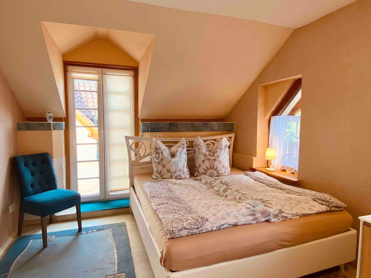 Freundliches Doppelzimmer im ländlichen Stil. Ein großes Doppelbett mit zwei Nachttischschränkchen, ein Tisch mit zwei Stühlen und ein großer Kleiderschrank bieten ausreichend Platz für einen Kurzurlaub. Das im Zimmer integrierte Bad mit Dusche und WC ermöglicht kurze Wege.