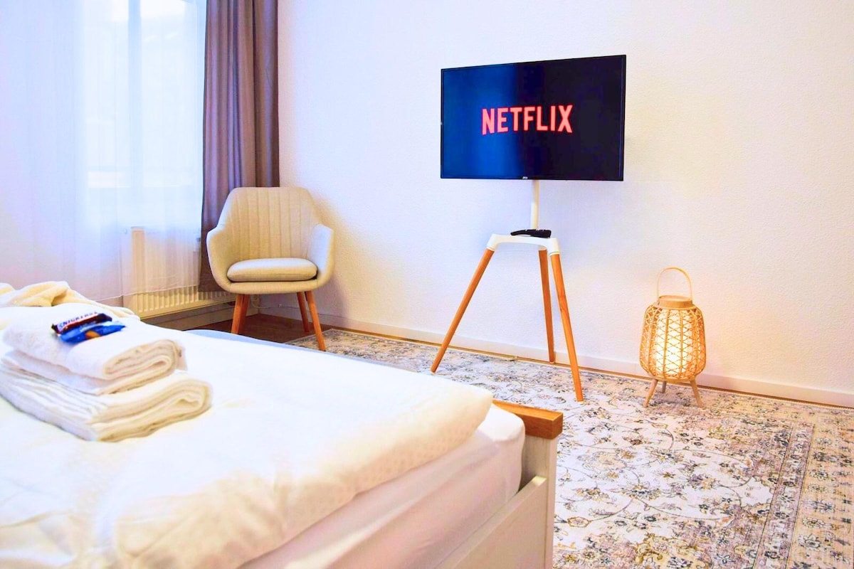 **Moderne, frisch sanierte Wohnung** Unsere Wohnung bietet Highspeed WLAN (300 Mbit/s), ein Kingsize-Bett, Arbeitstisch, Kleiderschrank und Smart-TV mit Netflix im Hauptschlafzimmer. Ein zweites Schlafzimmer mit zwei Einzelbetten (90x200 cm) ist ideal für Familien. Der offene Wohnbereich umfasst eine voll ausgestattete Küche, kostenlosen Tee/Kaffee und Smart-TV. Balkon, Waschmaschine mit Waschmittel und Einkaufsmöglichkeiten sind ebenfalls vorhanden.