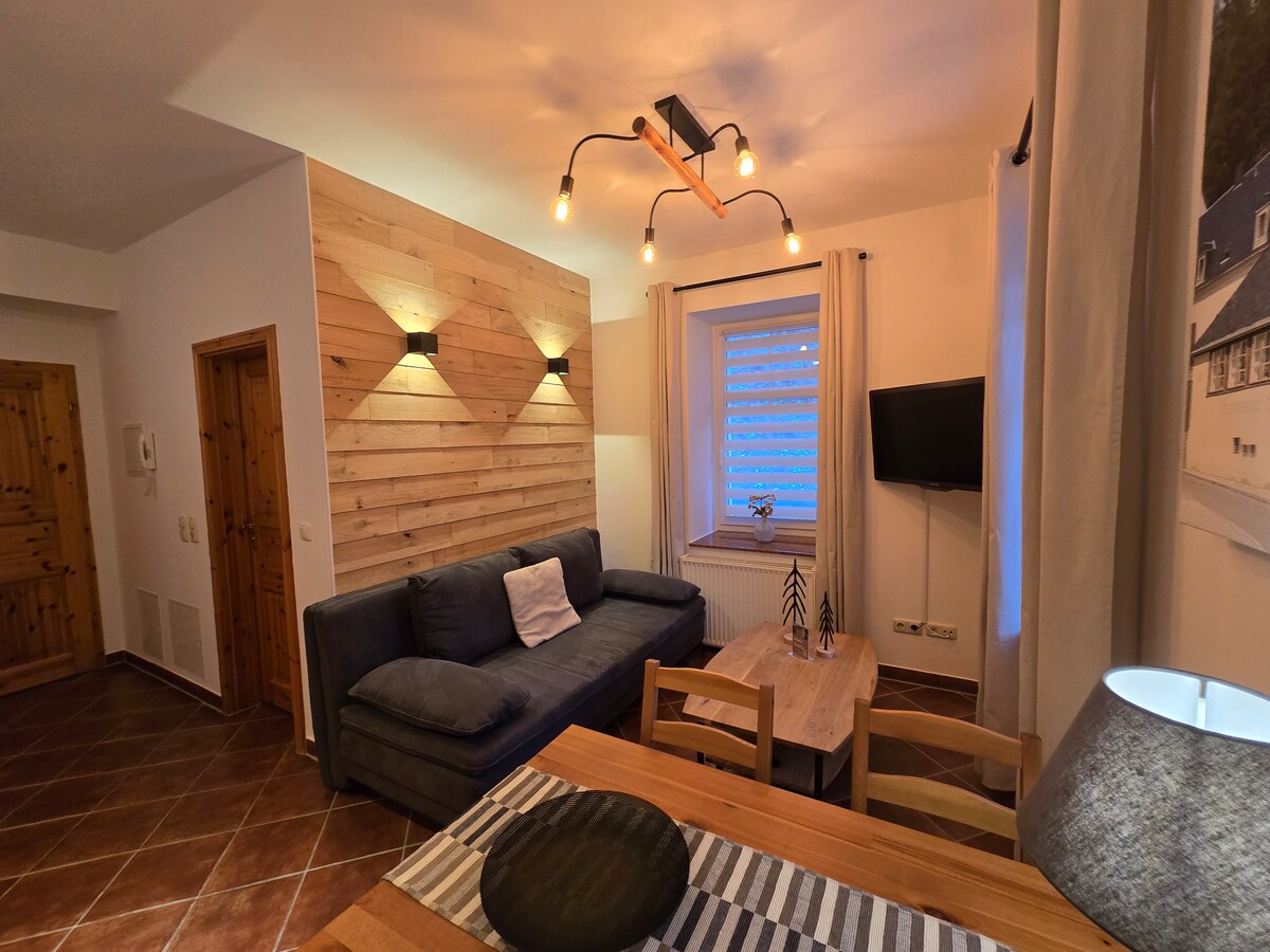 Our smallest apartment "Scheibenberg" on the ground floor: - Size: 39sqm - Occupancy of 1-4 people, 1 separate bedroom with box-spring double bed, open living area with kitchenette fully equipped with fridge, ceramic hob with oven, coffee maker, toaster, kettle, dining area up to 4 people, optional sofa bed with topper, 2.00mx1.65m, Flat TV, bathroom with shower and toilet, cosmetic mirror and hairdryer, baby bed and high chair, dog after registration 8, - Euro per day