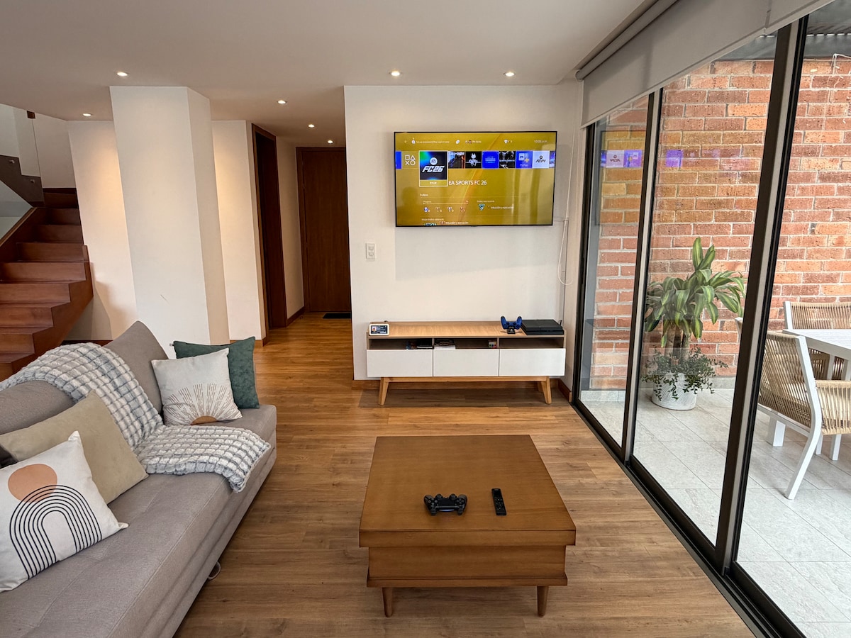 Relax in a cozy space full of comfort with a private Jacuzzi and a spectacular room with a home theater and rest in a luxurious bed in a quiet, pleasant and safe environment 2 rooms and 1 sofa bed, Smart TV, Fast Wifi, Netflix kitchen equipped with all the essential elements, close to the center, minutes from the main parks and shopping centers. Electric fireplace. Washer and dryer so you don't need to leave the place. It is 15 minutes from the Airport and Transport Terminal.